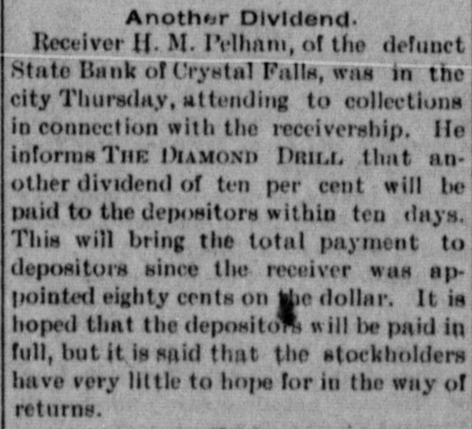 Another Dividend. Receiver H. M. Pelham, of the defunct State Bank of Crystal Falls, was in the city Thursday, attending to collections in connection with the receivership. He informs THE DIAMOND DRILL that another dividend of ten per cent will be paid to the depositors within ten days. This will bring the total payment to depositors since the receiver was appointed eighty cents on the dollar. It is hoped that the depositors will be paid in full, but it is said that the stockholders have very little to hope for in the way of returns.