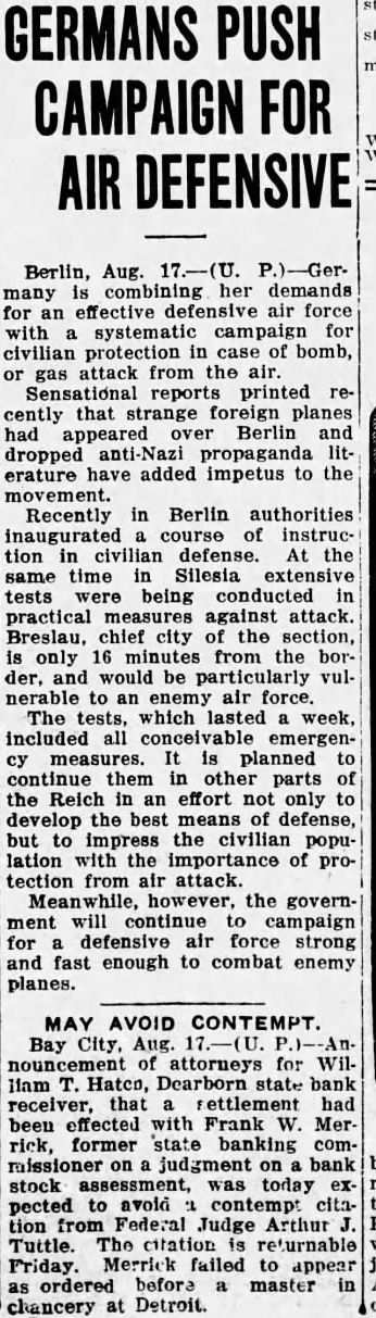 GERMANS PUSH CAMPAIGN FOR DEFENSIVE Berlin, Aug. 17.-(U. P.)-Germany combining her demands an effective defensive air force with systematic campaign for protection in case of bomb, or attack from the air. Sensational reports printed recently that strange foreign planes had appeared over Berlin and dropped anti-Nazi propaganda literature have added impetus to the movement. Recently in Berlin authorities inaugurated course of instruction civilian defense. At the same time in Silesia extensive tests being conducted in practical against attack. Breslau, chief city of the section, only 16 from the border, and would be particularly vulto an enemy air force. The tests, which week, included all cy measures. It is planned them in other parts the Reich an effort not only to develop the best means of defense, but to impress the civilian population with the importance of protection from air attack. Meanwhile, however, the government continue to campaign for defensive force strong and fast enough to combat enemy planes. MAY AVOID CONTEMPT. Bay City, Aug. nouncement attorneys for William Hatco, Dearborn state bank receiver, that settlement had been effected with Frank Merrick, former state banking commissioner judgment on bank stock assessment, today pected to avoid contempt citation from Federal Judge Arthur Tuttle. The citation returnable Friday Merrick failed to appear ordered before master in chancery at Detroit.