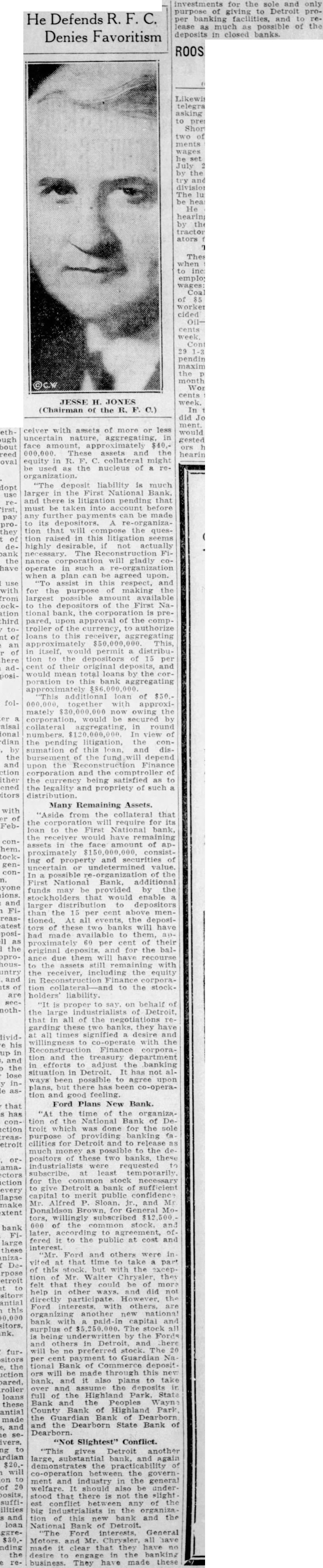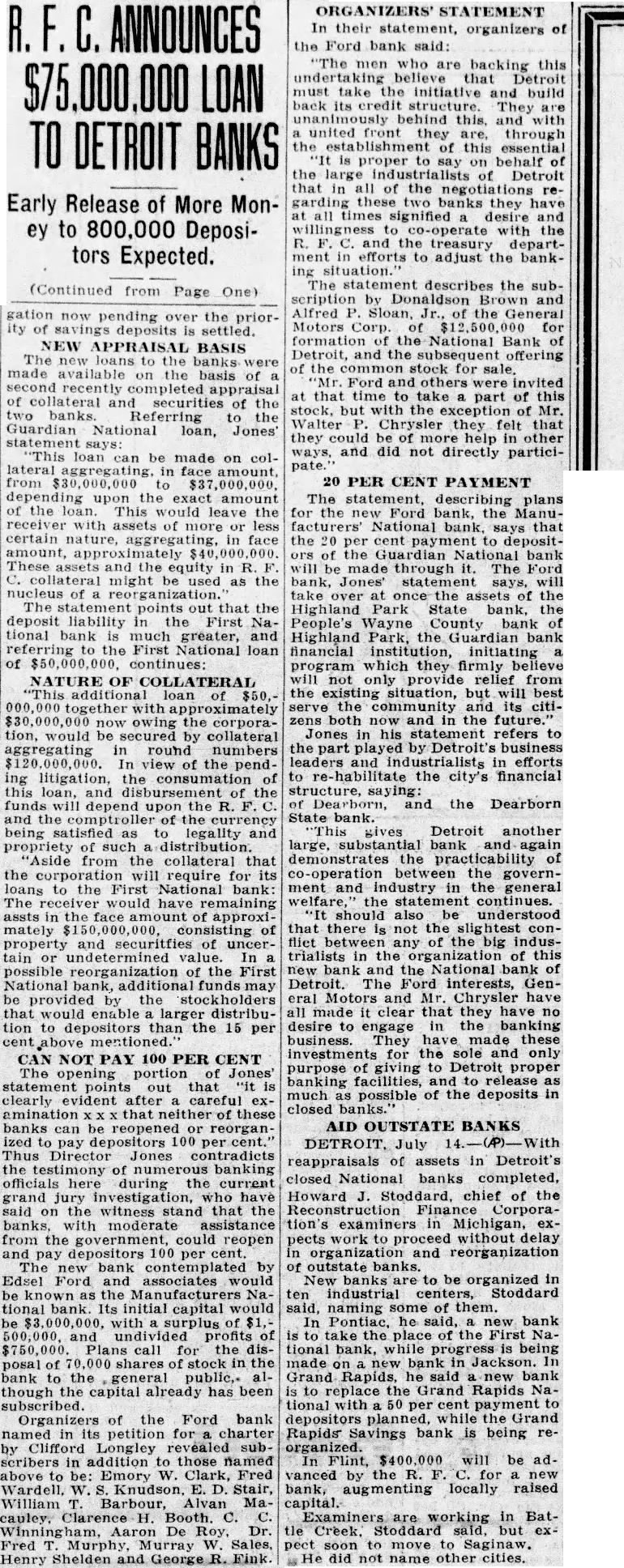 R.F.C. ANNOUNCES $75,000,000 LOAN TO DETROIT BANKS Early Release of More Money to 800,000 Depositors Expected. (Continued from Page One) gation now pending over the priority of savings deposits is settled. NEW APPRAISAL BASIS The new loans to the banks were made available on the basis of second recently completed appraisal of collateral and securities of the two Referring to the Guardian National loan, statement says: "This loan can be made on colfrom $30,000,000 to $37,000,000. depending upon the exact amount of the loan. This would leave the receiver with assets of more or less certain nature, in face These assets and the equity in C. collateral might be used as the nucleus of The statement points out that the deposit liability in the First National bank much greater, and referring to the First National loan of $50,000,000. continues: NATURE OF COLLATERAL "This additional loan of $50,000 000 together with now owing the corporation, would be secured by collateral aggregating in round numbers In view of the pending litigation, the consumation of this loan, and disbursement of the funds will depend upon the R. and the comptroller of the currency being satisfied as to legality and propriety of such distribution "Aside from the collateral that the corporation will require for its loans to the First National bank The receiver would have remaining assts in the face amount of approximately of property and securities of uncertain or undetermined value. In possible reorganization of the First National bank, additional funds may be provided by the stockholders that would enable larger distribution to depositors than the 15 per cent above mentioned. CAN NOT PAY 100 PER CENT The opening portion of Jones statement points out that clearly evident after careful examination that neither of these banks can be reopened or reorganized to pay depositors 100 per Thus Director Jones contradicts the testimony of numerous banking officials here during the current grand jury investigation, who have said on the witness stand that the banks, with moderate assistance from the government, could reopen and pay depositors 100 per The new bank contemplated by Edsel Ford and associates would be known as the Manufacturers National bank. Its initial capital would be with surplus of 500,000. and undivided profits of Plans call for the disposal of shares of stock in the bank to the general public,- although the capital already has been subscribed. Organizers of the Ford bank named in its petition for a charter by Clifford Longley revealed subscribers in addition to those named above to be: Emory W. Clark, Fred Wardell. W. S. Knudson, E. D. Stair, William T. Barbour, Alvan Macauley, Clarence H. Booth. C. Aaron De Roy. Dr. Fred T. Murphy Murray W. Sales, Henry Shelden and George I Fink ORGANIZERS' STATEMENT In their statement, organizers of the Ford bank said: "The men who are backing this undertaking believe that Detroit must take the initiative and build back its credit structure. They are unanimously behind this. and with united front they are, through the of this essential 'It is proper to say on behalf of the large industrialists of Detroit that in all of the negotiations regarding these two banks they have all times signified desire and willingness to co-operate with the R. C. and the treasury department in efforts to adjust the banking situation." The statement describes the subscription by Donaldson Brown and Alfred P. Sloan, Jr., of the General Motors Corp. of for formation the National Bank of Detroit, and the subsequent offering of the stock for sale, "Mr. Ford and others were invited at that time to take part of this stock, but with the exception of Mr. Walter P. Chrysler they felt that they could help in other ways, and did not directly participate." 20 PER CENT PAYMENT The statement, describing plans for the Ford bank, the Manufacturers' National bank, says that the 20 per cent payment to depositors of the Guardian National bank will be made through it. The Ford bank, Jones' statement says, will take over at once the assets of the Highland Park State bank, the People's Wayne County bank of Highland Park, the Guardian bank financial institution, initiating program which they firmly believe will not only provide relief from the existing situation, but will best serve the community and its citizens both now and in the future. Jones in his statement refers to the part by Detroit's business leaders and industrialists in efforts to habilitate the city's financial structure, saying: of Dearborn, and the Dearborn State bank. This gives Detroit another large, substantial bank and again demonstrates the practicability of co-operation between the government and industry in the general welfare, the statement continues. "It should also be understood that there is not the slightest confliet between any of the big industrialists in the organization of this new bank and the National bank of Detroit. The Ford interests, General Motors and Mr. Chrysler have all made it clear that they have no desire to engage in the banking business. They have made these investments for the sole and only purpose of giving to Detroit proper banking facilities, and to release as much as possible of the deposits in closed AID OUTSTATE BANKS DETROIT. July With reappraisals of assets in Detroit's closed National banks completed, Howard J. Stoddard, chief of the Reconstruction Finance Corporation's examiners in Michigan, expects work to without delay in organization and reorganization of outstate banks. New banks are to be organized in ten industrial centers, Stoddard said, naming some of them. In Pontiac, he said, new bank is take the place of the First National bank, while progress being made on new bank in Jackson. In Grand Rapids. he said new bank is to replace the Grand Rapids National with 50 per cent payment to depositors planned, while the Grand Rapids Savings bank is being reorganized. In Flint, $400.000 will be advanced by the R. F. for new 