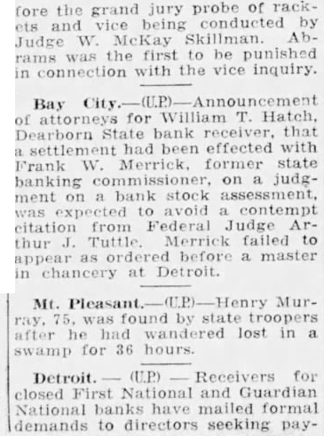 attorneys for William T. Hatch, Dearborn State bank receiver, that settlement had been effected ... William T. Hatch, Dearborn State bank receiver ... settlement had been effected with Frank W. Merrick ... to avoid contempt citation ... William T. Hatch, Dearborn State bank receiver was to avoid contempt citation ... (Bay City / Dowagiac / Ann Arbor articles, Aug. 17, 1933).