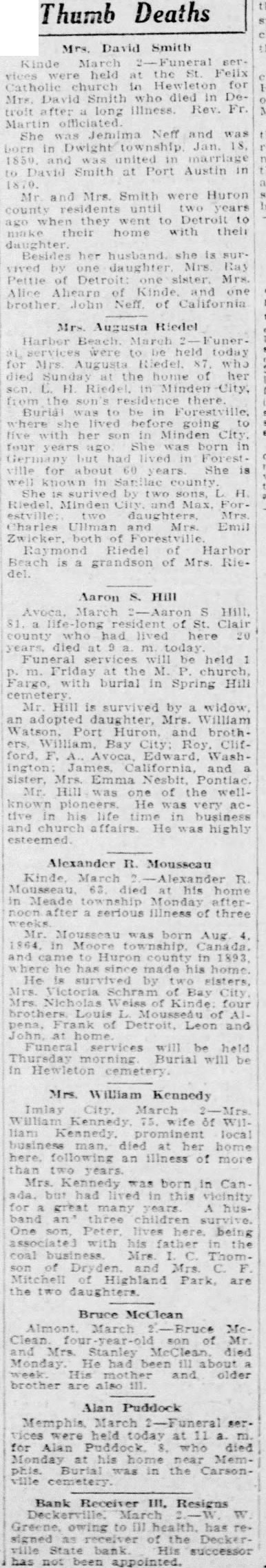 Thumb Deaths Mrs. David Smith Kinde held at Felix Catholic in for Smith who died in Mrs. of Fr. long Martin Jemima Neff and was She born Dwight Jan. in 1850 David Smith at Port Austin in and Smith were Huron county years went to Detroit to make their with their Besides she vived by Mrs Ray of Mrs. one brother of California Mrs. Augusta Riedel Harber to held today for Augusta who died Sunday the home of her Minden Burial to where going her son in Minden four She was born in had Forest for about 60 She is known in county. She by H. Mrs. Ullman and Mrs. Emil both Forestville mond Riedel of Harbor Beach a grandson of Mrs. Riedel. Aaron S. Hill March S resident of St. Clair county had lived here 20 died today Funeral services be held 1 m. Friday the M. church, with burial in Spring Hill Hill is survived by an adopted daughter, Mrs. William sister, Mrs. Emma Nesbit, Pontiac Mr. Hill one of the wellknown pioneers. He was very active in his in business and affairs. He was highly Alexander R. Mousseau March -Alexander died his home in Meade Monday noon after a serious illness of three Mousseau was born came Huron county in he has since made his home. He is by two sisters. Victoria of Bay City Mrs of Kinde four brothers Louis Mousseau of Frank of Detroit, Leon and at Funeral services will be held Thursday morning Burial will be in Hewleton cemetery Mrs. William Kennedy Imlay City, March 2-Mrs. prominent local business man. died her home here. following an illness of more two Mrs. Kennedy was born in Canhad lived this vicinity great huschildren One Peter here being associated with father in the Mrs. Thomof and Mrs. Mitchell Highland are Bruce McClean Almont March Bruce son Mr. and Mrs. McClean died Monday. He been about His and older brother are also Alan Puddock vices were held today at 11 for Alan who died Monday at his home near MemBurial was in the Bank Receiver III, Resigns owing to has as receiver of the DeckerState bank successor has not been appointed.