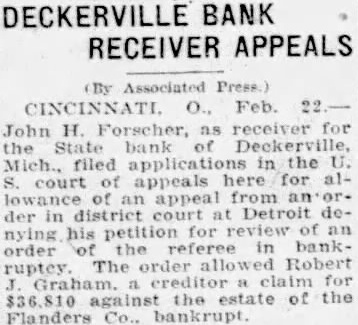 DECKERVILLE BANK RECEIVER APPEALS (By Associated Press.) CINCINNATI. O., Feb. John H. Forscher, receiver for the State bank Deckerville, Mich., filed applications in the U. S. court of appeals here for allowance of an appeal from court at Detroit deder in nying his petition for review of an order in bankruptey The order allowed Robert Graham. creditor claim for $36,810 against the estate of the Flanders Co., bankrupt