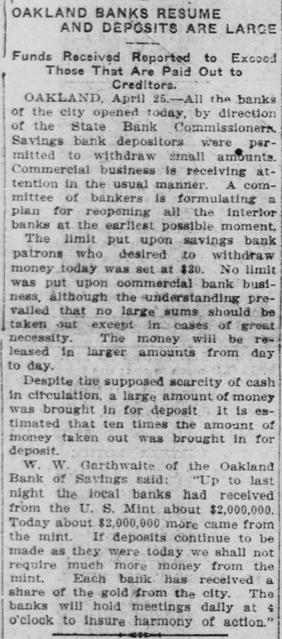 OAKLAND BANKS RESUME AND DEPOSITS ARE LARGE Funds Received Reported to Exceed Those That Are Paid Out to Creditors. OAKLAND, April 25.-All the banks of the city opened today, by direction of the State Bank Commissioners. Savings bank depositors were permitted to withdraw small amounts. Commercial business is receiving attention in the usual manner. A committee of bankers is formulating a plan for reopening all the interior banks at the earliest possible moment. The limit put upon savings bank patrons who desired to withdraw money today was set at $30. No limit was put upon commercial bank business, although the understanding prevailed that no large sums should be taken out except in cases of great necessity. The money will be released in larger amounts from day to day. Despite the supposed scarcity of cash in circulation, a large amount of money was brought in for deposit It is estimated that ten times the amount of money taken out was brought in for deposit. W. W. Garthwaite of the Oakland Bank of Savings said: "Up to last night the local banks had received from the U. S. Mint about $2,000,000. Today about $2,000,000 more came from the mint. If deposits continue to be made as they were today we shall not require much more money from the mint. Each bank has received a share of the gold from the city. The banks will hold meetings daily at 4 o'clock to insure harmony of action."