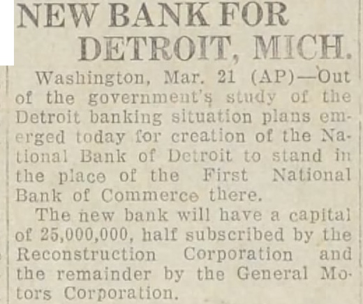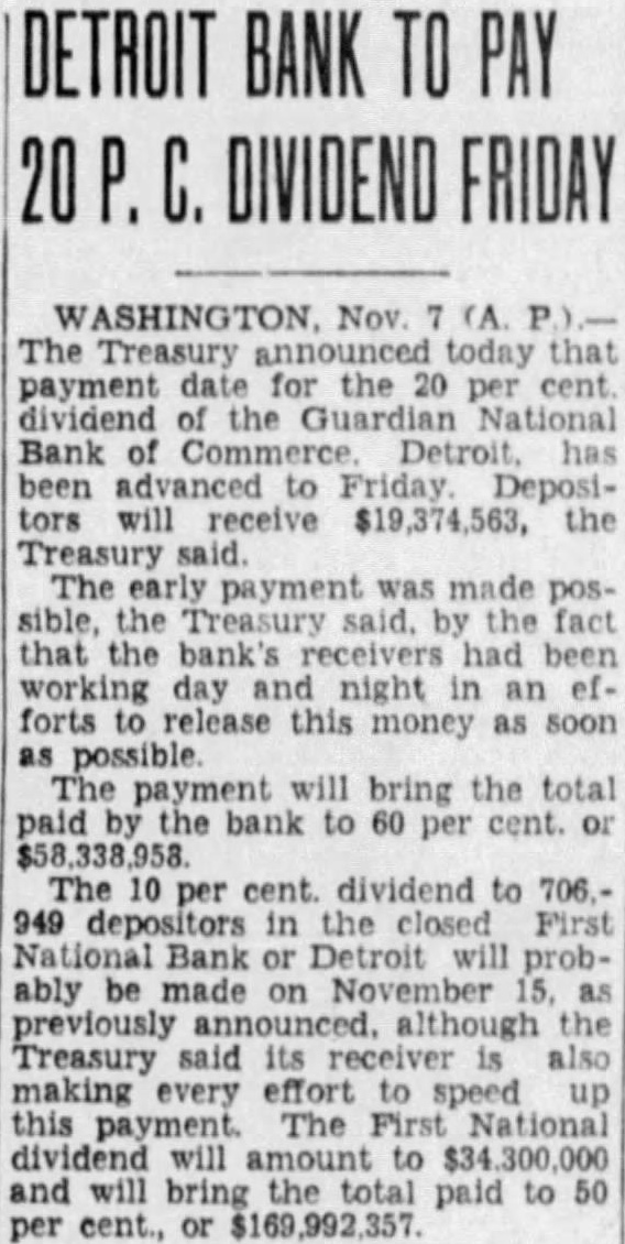 "Then on August Mr. MacDonald wrote another letter which he plan for the the First National only change of any consequence is in Paragraph two, which in effect withdraws the proposal for compromise of assessliability. The features of this ment plan were vigorously objected to Comptroller O'Connor me over the telephone primarily the sessment not to go positors. but was retained by the stockholders. This being the last status of any negotiations, correspondence the banking group, of course did not know was contemplated by them only to for payoff through advances from the "This, therefore, seems to me to leave the matter ready immediate action, on assumption. press reports are correct, that the the comptroller and the through have concluded their appraisal assets sufficiently to them how much they can adfor the payoff. know of no vance reason why this cannot be immediatedone "When it comes to consideration of the the old banks, however, if consideration to be given to then vitally important to the government, to the depositors, and to people as to who the bank. Let us look for moment to who are responsible for the of the Detroit Bankers that who signed the notices stockholders the Peoples' Wayne County bank, First National bank 'in Detroit. Detroit Se. curity Trust company. Bank of Michigan and Peninsular bank This circular. dated October 1929. urged the surrender stock in these state and national and trust companies for stock the Detroit Bankand signed Julius H. Haas, John Bodde Emory W. D. Dwight Douglas, Ralph Stone Albert Green, Mc. Pherson Brownsing John Ballantyne, Livingstone, E. J. and H. Hits Holding Companies sincerely regret that Judge Keidan, his opinion, did not with the orgy of high finance in the management the banks affairs came before him. However, according press reports night, Prosecuting Attorney Toy quoted as saying the grand hearings forever disposed holding companies for banks. The holding company plans for control banks never should have been permitted and the creation of them obviously for the purpose of getting around the intent the hope there no misunderstanding between Judge Keidan me. wrote him the following letter on September 15: gather from the press that you have concluded the ing the Detroit Bankers National Detroit group, are now proceeding with the Detroit Union group. During with Prosecuting Attorney Toy pressed the hope that might be permitted to go on the witness stand to submit new evidence in connection with the Detroit Bankers First National Detroit group, before you concluded, other before started with the Union Detroit group. that seems not have met your view have considerable evidence concerning the Guardian Detroit Union and am writing to ask you for permission submit this before you the grand jury hearing. May have advice as may be permitted to testify?' "On Sunday, September heard indirectly that Judge Keidan proposed the jury September 18. Learning that Judge Keidan not in his 16, the day my letter should have rived there, alarmed for fear he would close the grand jury before my letter was received. which in all probability would not receive until Monday morning. September 18 therefore contacted him Sunday night and advised him had writen this letter and asked that be permitted again go on the witness stand. not only reply the charges that had against me during the past month. but evidence "Judge Keldan disinclined to do this but an with me Frank Couzens' home at September farm to keep Judge Keidan then argued against appearing on the witness stand for the reason that might introduce new which would cause the bankers again quest and fur. ther delay the conclusion of the grand jury we left he advised me he would think over m. Monday telephoned me that would permitted the but my evidence would replying to those had attacked me since was last on the witness he would not consent to any other of being anxious to have that opportu"Later in day, that is. before went on the witness with Judge the testimony advised had not at that time been able secure transcript of the testimony given by Longley and Kanthe previous September the testimony that had been the morning of September Then Judge Keidan handed copy testimony taken September contained approximately 100 have an opportunity before going on the witness Neither to see transcript the taken the was submit all the testimony had collected particular respect Guardian Detroit Group. nor marshal my facts the statements made by