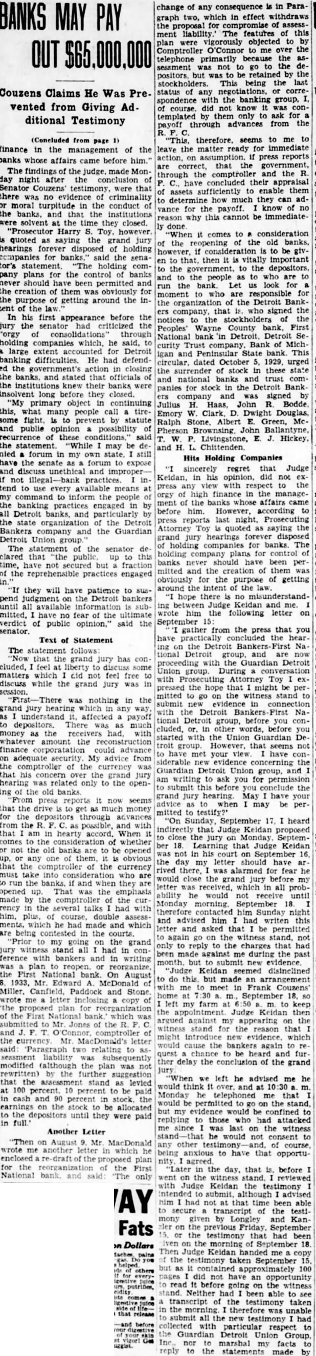 (Concluded from page finance in the management of the banks whose affairs came before him." The findings the judge, made Monnight after conclusion of testimony, were that there was evidence of criminality moral turpitude in the conduct the banks, and that the institutions were solvent the time they closed. "Prosecutor Harry S. Toy. however. quoted as saying the grand jury hearings forever disposed of holding companies for banks." said the senator's "The holding company plans for the control of banks never should been permitted and the creation of them was obviously for the purpose of getting around the intent In his first appearance before the jury the senator criticized the "orgy of through holding which, he said, large extent for Detroit banking difficulties. He had defendthe government's closing the banks. and stated that officials of institutions knew their banks were insolvent long before they closed. "My primary object continuing this, what many people call some fight, prevent by statute and public opinion possibility recurrence of these conditions," said the statement. "While may be nied forum in my own state, have the senate forum to expose and discuss unethical and improperpractices. tend to available means command to inform the people the banking practices engaged in all Detroit banks, and the the Detroit Bankers company and the Guardian Detroit Union The statement of the senator declared that up to this time, have not but fraction the reprehensible practices engaged they will have patience to pend judgment the Detroit bankers until all available information mitted, have no fear of the ultimate verdict of public opinion," said the senator.