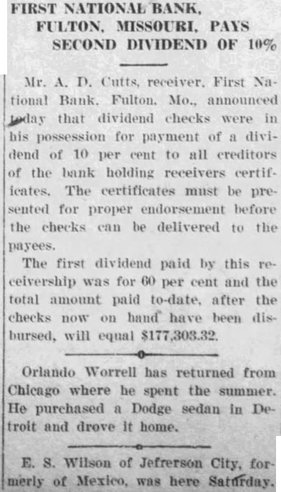 FIRST NATIONAL BANK SUSPENDED BUSINESS BOARD OF DIRECTORS OF FULTON INSTITUTION CLOSED DOORS WEDNESDAY A. M. DEPOSITORS WILL NOT LOSE No Irregularities But General Business Depression and Lack of Money Given as Cause. The First National Bank of Fulton suspended business Wednesday morning, April 14th. This action was taken at the direction of the Board of Directors of the bank at the conclusion of a conference held at the bank, Tuesday night. Vance L. Sailor, of Kirkwood, bank examiner of the Eighth Federal District, is in charge of the bank. He came to Fulton Saturday morning at the request of the officers of the bank and began an examination of the books of the institution. John S. Wood, his chief, spent Sunday and Sunday night in this city going over the affairs of the bank. "On account of general business depression and scarcity of money in the country it has not been possible in recent months to keep deposits up to a point where the bank could make money," was the reason for suspending business at this time as given the Fulton newspaper men in a conference with the bank officials Wednesday morning. "It was deemed the best way to protect the interests of the depositors and of the stockholders," they continued. The last financial statement published was of December 31, 1925. At that time the bank had individual deposits of $179,965.96. time deposits of $78,536.37. Mr. Terry said that the individual deposits were about $170,000 at this time and that the deposits were approximately $91,500. The bill payable, including notes and bills rediscounted, were $144,000 on December last and Mr. Terry said these figures were substantially the same now. The bank has a capital stock of $100,000, surplus $40,000 and undivided profits of about $6,000, making a total of approximately $146.000. Efforts are being made for the reorganization of the bank and until every effort has been exhausted to perfect this reorganization no receivership will be requested. The bank was suspended by the Directors and will be held in this condition pending the reorganization. The directors of the bank are: T. P. Harrison, president: Baker Terry, vice-president; Crockett Harrison, vice-president: John W. Suggett, cashier: W. S. Vivion William H. Yates and Dr. C. H. Christian Mrs. Pearl Gooldy Ward and Miss Emma Adcock are assistant cashiers Mr. Vance, the representative of the federal bank commissioner charge of the bank now, was not permitted to make a statement to the press because of regulations of his department. The statement was made to the newspaper representatives Wednesday morning by bank officials that there were no irregularities in the accounts or affairs of the bank and that no one employed in the bank was indebted to it. Officers of the bank also say they are sure there will be no loss to any depositor of the bank. The appearance of the notice on the door of the First National Bank at opening hour attracted the attention of those passing and of those wishing to do business there. However, there was no semblance of excitement on the streets and the busi ness of the city was continued as usual. The willingness of the bank officers to make an explanation of the closing of the bank and the fact that it was done by Board of Directors, coupled with the assurances that the depositors would lose none of their money, allayed all excitement. If you substitute lard or drippings for butter in a cake recipe add a little lemon juice. You will not notice the change in flavor nearly as much.