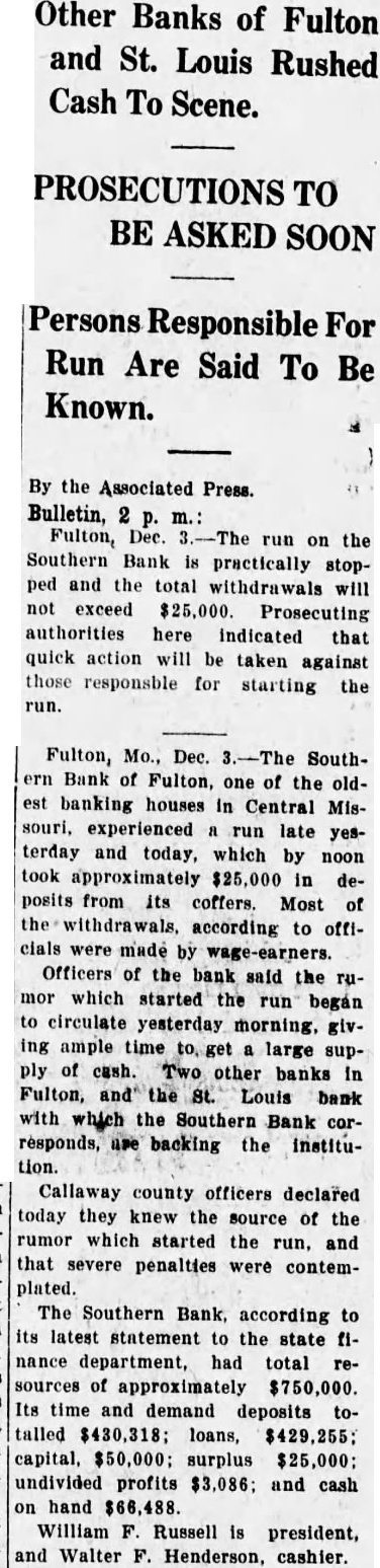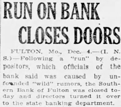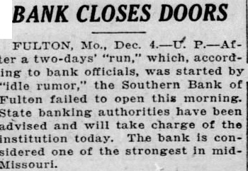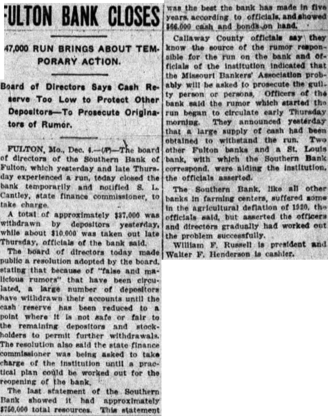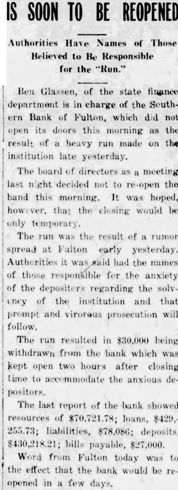 A run on the Southern Bank of Fulton last Thursday and Friday, during which time $47,000 was withdrawn, forced the institution to be closed by its directors Saturday. The wife of a laborer started the run when she withdrew $5.40 which she had on deposit. Officers say they believe they have discovered the source of rumor which started the run, and that they intend to prosecute the person responsible for it. The bank has served the community fifty years and was a strong institution until the false rumor caused the withdrawal of so much eash that the bank had to be closed. Two other Fulton banks and a St. Louis bank and all depositors were paid as they demanded their money, without question. Bank officials anmounce that they have plans under way for reopening.
