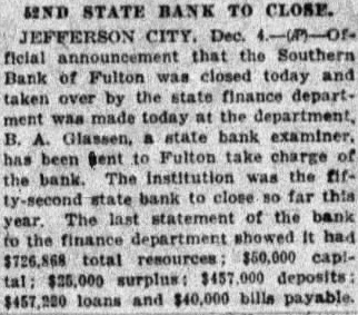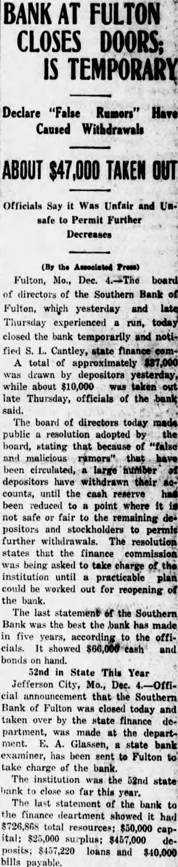 The board of directors today made public a resolution adopted by the board, stating that because of "false and malicious rumors" that have been circulated, a large number depositors have withdrawn their accounts, until the cash reserve has been reduced to a point where it is not safe or fair to the remaining depositors and stockholders to permie further withdrawals. The resolution states that the finance commission was being asked to take charge of the institution until a practicable plan could be worked out for reopening of the bank. The last statement of the Southern Bank was the best the bank has made in five years, according to the officials. It showed $66,000 cash and bonds on hand. 52nd in State This Year Jefferson City, Mo., Dec. 4.-Official announcement that the Southern Bank of Fulton was closed today and taken over by the state finance department, was made at the department. E. A. Glassen, a state bank examiner, has been sent to Fulton to take charge of the bank. The institution was the 52nd state bank to close so far this year. The last statement of the bank to the finance deartment showed it had $726,868 total resources; $50,000 capital: $25,000 surplus; $457,000 deposits; $457,220 loans and $40,000 bills payable.