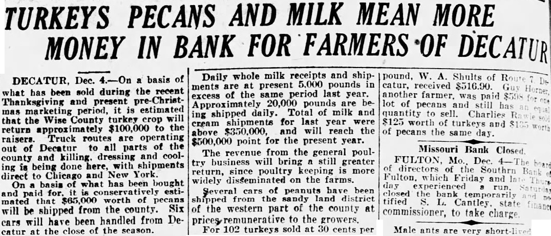 TURKEYS PECANS AND MILK MEAN MORE MONEY IN BANK FOR FARMERS OF DECATUR