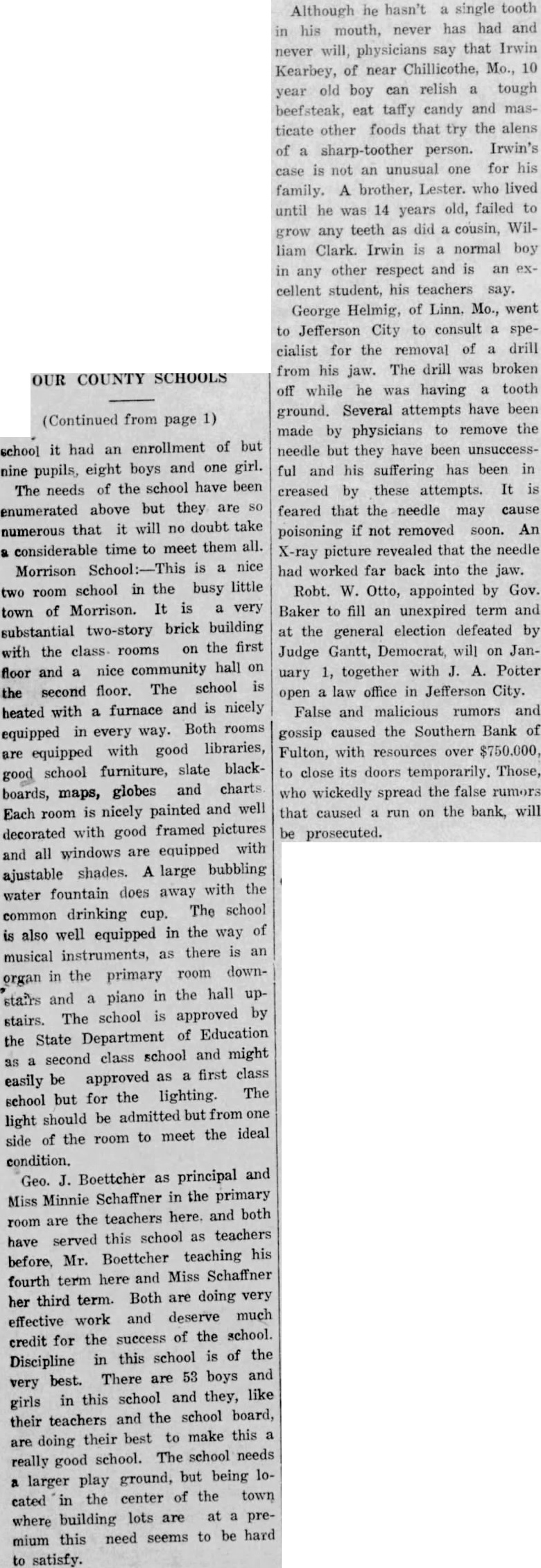 Although he hasn't a single tooth in his mouth, never has had and never will, physicians say that Irwin Kearbey, of near Chillicothe, Mo., 10 year old boy can relish a tough beefsteak, eat taffy candy and masticate other foods that try the alens of a sharp-toother person. Irwin's case is not an unusual one for his family. A brother, Lester. who lived until he was 14 years old, failed to grow any teeth as did a cousin, William Clark. Irwin is a normal boy in any other respect and is an excellent student, his teachers say. George Helmig, of Linn. Mo., went to Jefferson City to consult a specialist for the removal of a drill from his jaw. The drill was broken off while he was having a tooth ground. Several attempts have been made by physicians to remove the needle but they have been unsuccessful and his suffering has been in creased by these attempts. It is feared that the needle may cause poisoning if not removed soon. An X-ray picture revealed that the needle had worked far back into the jaw. Robt. W. Otto, appointed by Gov. Baker to fill an unexpired term and at the general election defeated by Judge Gantt, Democrat, will on January 1, together with J. A. Potter open a law office in Jefferson City. False and malicious rumors and gossip caused the Southern Bank of Fulton, with resources over $750,000, to close its doors temporarily. Those, who wickedly spread the false rumors that caused a run on the bank, will be prosecuted.