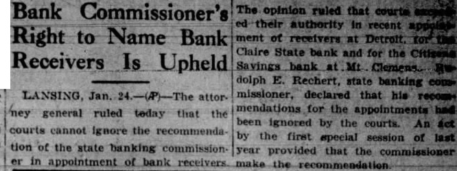 Bank Commissioner's Right to Name Bank Receivers Is Upheld LANSING, Jan. attorney general ruled today that the courts cannot Ignore the recommendation of the state banking commission. er in appointment of bank receivers. The opinion ruled that courte their authority recent ment of receivers at Detroit. Claire State bank and for the Citizens Savings bank Clemens. dolph E. Rechert, state banking commissioner, declared that his mendations for the appointments had been ignored by the courts. An act by the first special session of last year provided that the commissioner the