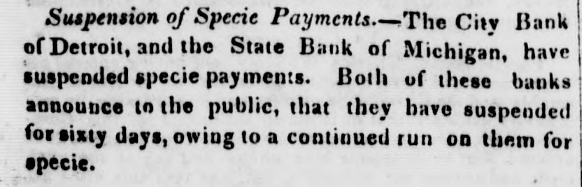 The City Bank of Detroit ... have suspended specie payments. Both of these banks announce to the public, that they have suspended for sixty days, owing to a continued run on them for specie.
