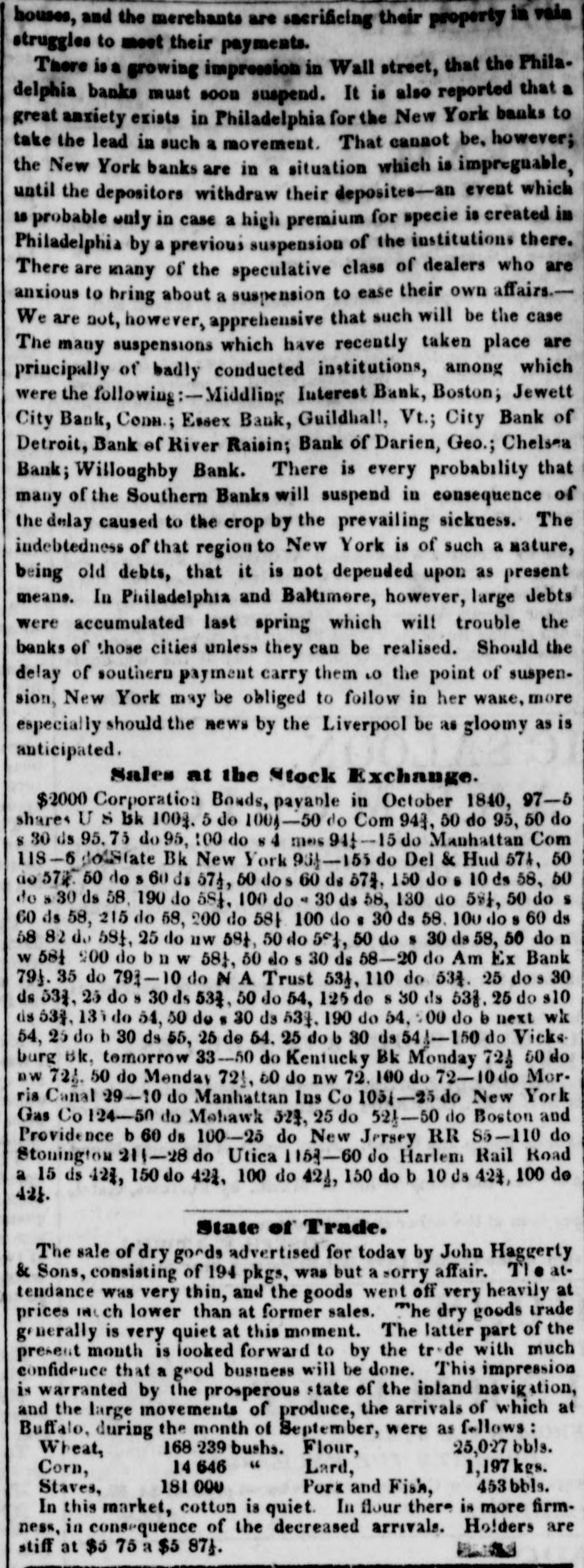 houses, and the merchants are sacrificing their property in vaia struggles to meet their payments. There is growing impression in Wall street, that the Philadelphia banks must soon suspend. It is also reported that a great anxiety exists in Philadelphia for the New York banks to take the lead in such a movement. That cannot be, however; the New York banks are in a situation which is impregnable, until the depositors withdraw their deposites-an event which is probable only in case a high premium for specie is created in Philadelphia by a previous suspension of the institutions there. There are many of the speculative class of dealers who are anxious to bring about a suspension to ease their own affairs.We are not, however, apprehensive that such will be the case The many suspensions which have recently taken place are principally of badly conducted institutions, among which were the following:-Middling Interest Bank, Boston, Jewett City Bank, Conn; Essex Bank, Guildhall, Vt.; City Bank of Detroit, Bank el River Raisin; Bank of Darien, Geo.; Chelsea Bank; Willoughby Bank. There is every probability that many of the Southern Banks will suspend in consequence of the delay caused to the crop by the prevailing sickness. The indebtedness of that region to New York is of such a nature, being old debts, that it is not depended upon as present means. In Philadelphia and Baltimore, however, large Jebts were accumulated last spring which will trouble the banks of those cities unless they can be realised. Should the delay of southern payment carry them to the point of suspension, New York may be obliged to follow in her wake, more especially should the news by the Liverpool be as gloomy as is anticipated. Sales at the Stock Exchange. $2000 Corporation Bonds, payable in October 1840, 97-5 shares U S Bk 100g. 5 do 100A-50 do Com 943, 50 do 95, 50 do 30 ds 95.75 do 95, :00 do 84 mes941-15 do Manhattan Com 118-6 do4State Bk New York 93)-155 do Del & Hud 574, 50 do 57th 50 do s 60 ds 574, 50 dos 60 ds 573. 150 do s 10 ds 58, 50 do S 30 ds 58, 190 do 5St, 100 do a 30 ds 58, 130 do 581, 50 do S 60 ds 58, 215 do 58, 200 do 58 100 do 8 30 ds 58. 100 do S 60 ds 58 82 do 581, 25 do nw 581, 50 do 5th, 50 do S 30 ds 58, 50 do n w 581 900 do b n W 581, 50 do S 30 ds 58-20 do Am Ex Bank 79}. 35 do 791-10 do N A Trust 531, 110 do 534. 25 dos 30 ds 53 25 do 8 30 ds 537, 50 do 54, 125 de S 30 ds 53g. 25 do s10 ds 53g. 13i do 54, 50 do s 30 ds 534. 190 do 54, 00 do b next wk 54, 25 do b 30 ds 55, 25 de 54. 25 do b 30 ds 544-150 do Vicks burg Bk. tomorrow 33-50 do Kentucky Bk Monday 72 50 do nw 724. 50 do Menday 721, 50 do nw 72.100 do 72-10do Morris Canal 29-10 do Manhattan Ins Co 1051-25 do New York Gas Co 124-50 do Mohawk 524, 25 do 521-50 do Boston and Providence 60 ds 100-25 do New Jersey RR SS-110 do Stonington 211-28 do Utica 1153-60 do Harlem Rail Road a 15 ds 124, 150 do 421, 100 do 424, 150 do b 10 ds 424, 100 de 421. State of Trade. The sale of dry goods advertised for today by John Haggerty & Sons, consisting of 194 pkgs, was but a sorry affair. Tle attendance was very thin, and the goods went off very heavily at prices mach lower than at former sales. The dry goods trade generally is very quiet at this moment. The latter part of the present month is looked forward to by the tr de with much confidence that a good business will be done. This impression is warranted by the prosperous state of the inland navigation, and the large movements of produce, the arrivals of which at Buffalo, during the month of September, were as follows 25,027 bbls. 168 239 bushs. Flour, Wheat, " 14 646 1,197 kgs. Lard, Corn, 453 bbls. 181 000 Staves, Pork and Fish, In this market, cotton is quiet. In flour there is more firmness, in consequence of the decreased arrivals. Holders are stiff at $5 75 a $5 87}.