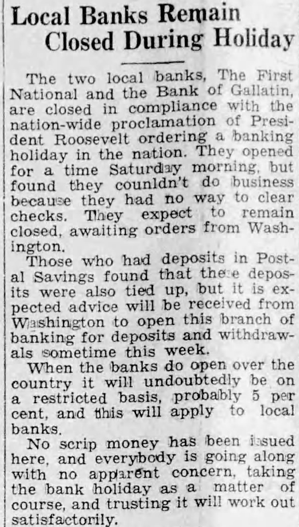 Local Banks Remain Closed During Holiday The two local banks, The First Bank Gallatin, National and compliance the closed proclamation President banking in the nation. opened holiday but for time Saturday counldn't do found they had no clear checks. expect remain They orders from Washclosed, awaiting ington. had deposits in PostThose who found that deposSavings up, but its were also advice will be received from pected to branch of deposits withdrawbanking this week. the banks do open the When undoubtedly be on country restricted probably per and this apply local cent, scrip money has been issued and going along apparent taking the bank holiday it will work out trusting