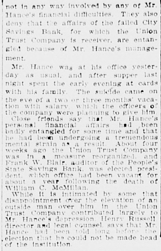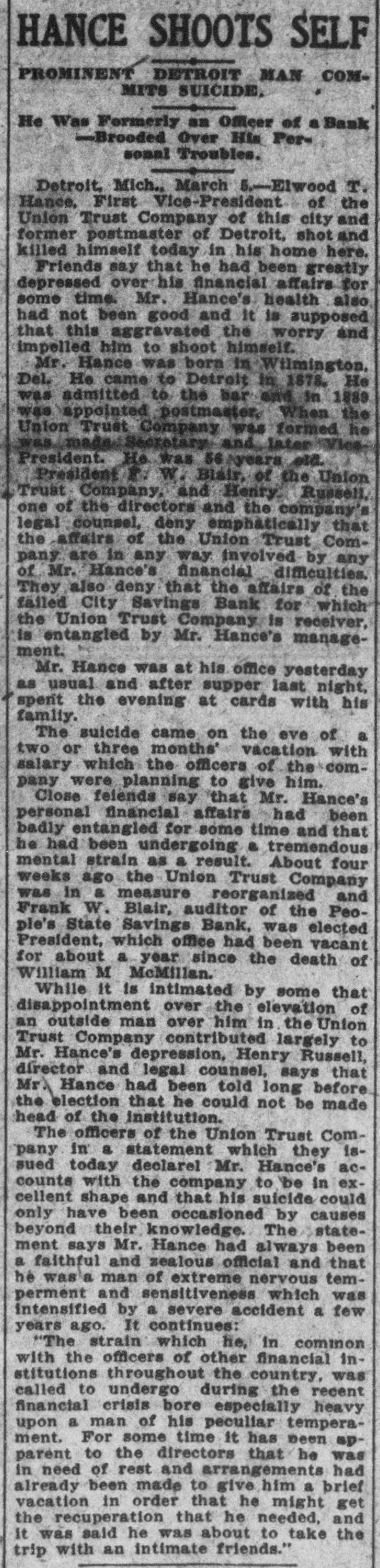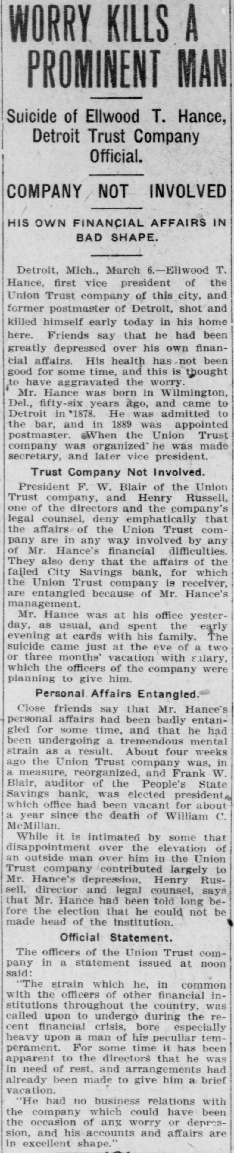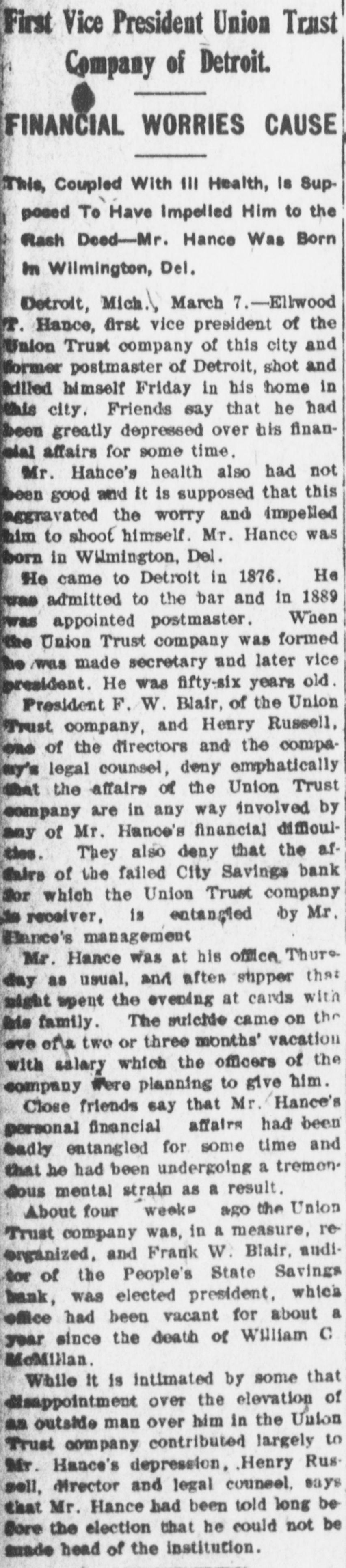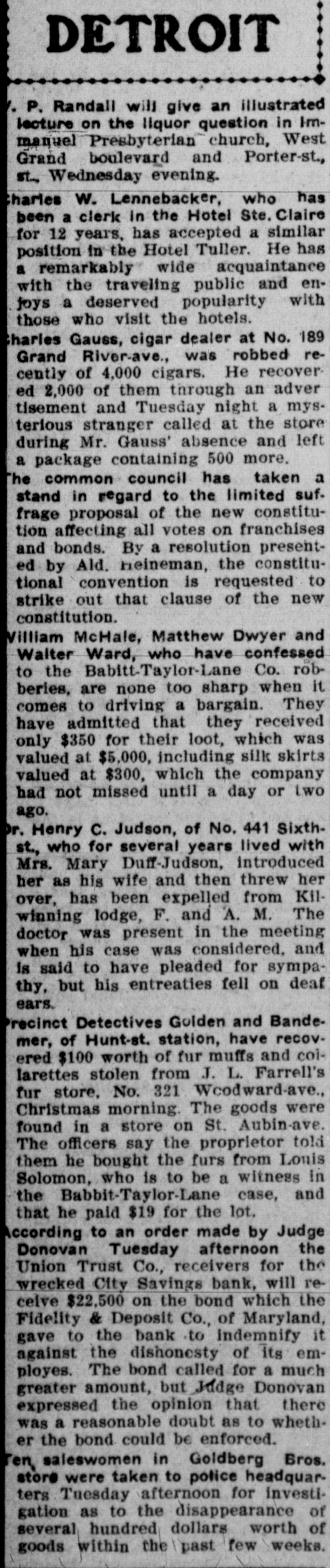 DETROIT P. Randall will give an illustrated lecture on the liquor question in Immanuel Presbyterian church, West Grand boulevard and Porter-st., st., Wednesday evening. harles W. Lennebacker, who has been a clerk in the Hotel Ste. Claire for 12 years, has accepted a similar position in the Hotel Tuller. He has a remarkably wide acquaintance with the traveling public and enjoys a deserved popularity with those who visit the hotels. harles Gauss, cigar dealer at No. 189 Grand River-ave., was robbed recently of 4,000 cigars. He recovered 2,000 of them through an adver tisement and Tuesday night a mysterious stranger called at the store during Mr. Gauss' absence and left a package containing 500 more. The common council has taken a stand in regard to the limited suffrage proposal of the new constitution affecting all votes on franchises and bonds. By a resolution presented by Ald. heineman, the constitutional convention is requested to strike out that clause of the new constitution. Villiam McHale, Matthew Dwyer and Walter Ward, who have confessed to the Babitt-Taylor-Lane Co. robberies, are none too sharp when it comes to driving a bargain. They have admitted that they received only $350 for their loot, which was valued at $5,000, including silk skirts valued at $300, which the company had not missed until a day or two ago. Dr. Henry c. Judson, of No. 441 Sixthst., who for several years lived with Mrs. Mary Duff-Judson, introduced her as his wife and then threw her over, has been expelled from Kilwinning lodge, F. and A. M. The doctor was present in the meeting when his case was considered, and is said to have pleaded for sympathy, but his entreaties fell on deaf ears. Precinct Detectives Golden and Bandemer, of Hunt-st. station, have recovered $100 worth of fur muffs and coilarettes stolen from J. L. Farrell's fur store, No. 321 Wcodward-ave., Christmas morning. The goods were found in a store on St. Aubin-ave. The officers say the proprietor told them he bought the furs from Louis Solomon, who is to be a witness in the Babbit-Taylor-Lane case, and that he paid $19 for the lot. According to an order made by Judge Donovan Tuesday afternoon the Union Trust Co., receivers for the wrecked City Savings bank, will receive $22,500 on the bond which the Fidelity & Deposit Co., of Maryland, gave to the bank to indemnify it against the dishonesty of its emplexes. The bond called for much