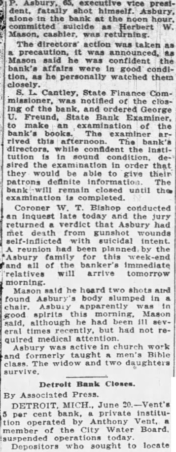 examination completed. Coroner W. T. Bishop conducted an inquest late today and the jury returned verdict that Asbury had met death from gunshot wounds suicidal intent. reunion had been planned by the Asbury family for this fand all of the immediate relatives will arrive tomorrow morning. Mason said he heard two shots and found body in chair. Asbury apparently good this said, although he had been 111 eral times recently. but had not required medical attention. Asbury active in church work taught Bible and class The widow and two daughters Detroit Bank Closes. By Associated Press. June 5 per cent private institution Anthony Vent, member of the City Water Board. suspended today. Depositors who sought to locate