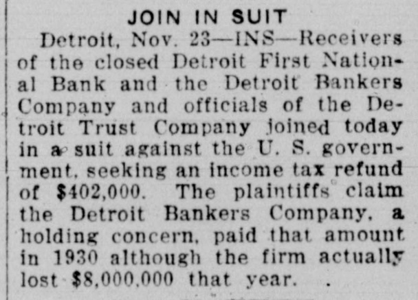 JOIN IN SUIT Detroit, Nov. 23-INS-Receivers of the closed Detroit First National Bank and the Detroit Bankers Company and officials of the Detroit Trust Company joined today in a suit against the U. S. government. seeking an income tax refund of $402,000. The plaintiffs claim the Detroit Bankers Company. a holding concern, paid that amount in 1930 although the firm actually lost $8,000,000 that year.