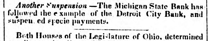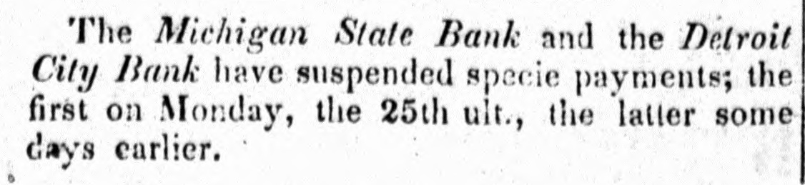 The Michigan State Bank and the Detroit City Bank have suspended specie payments: the first on Monday, the 25th ultimo, the latter some days earlier.