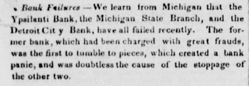 Bank Failures - We learn from Michigan that the Ypsilanti Bank, the Michigan State Branch, and the Detroit Cit y Bank, have all failed recently. The former bank, which had been charged with great frauds, was the first to tumble to pieces, which created a bank panic, and was doubtless the cause of the stoppage of the other two.