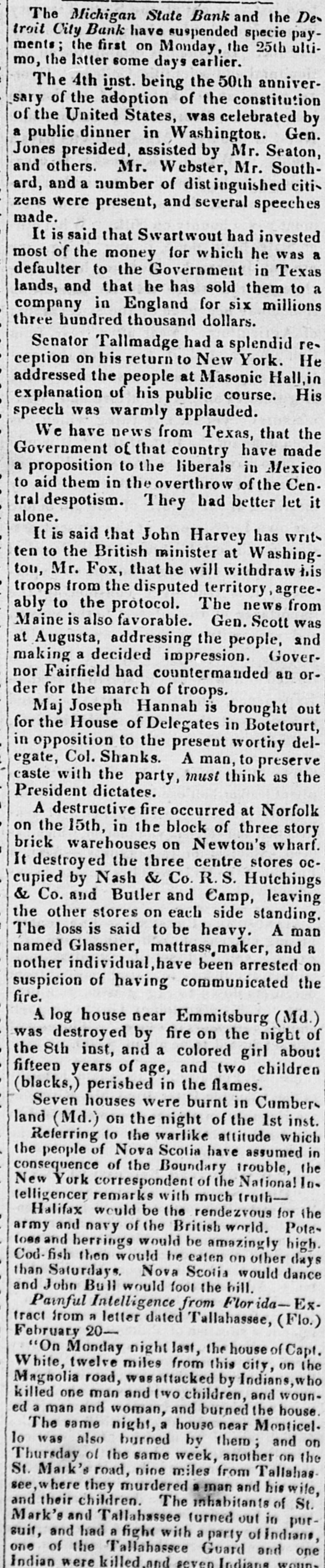 The Michigan State Bank and the De troit City Bank have suspended specie payments; the first on Monday, the 25th ultimo, the latter some days earlier. The 4th inst. being the 50th anniversary of the adoption of the constitution of the United States, was celebrated by a public dinner in Washington. Gen. Jones presided, assisted by Mr. Seaton, and others. Mr. Webster, Mr. Southard, and a number of distinguished citizens were present, and several speeches made. It is said that Swartwout had invested most of the money for which he was a defaulter to the Government in Texas lands, and that he has sold them to a company in England for six millions three hundred thousand dollars. Senator Tallmadge had a splendid reception on his return to New York. He addressed the people at Masonic Hall,i explanation of his public course. His speech was warmly applauded. We have news from Texas, that the Government of that country have made a proposition to the liberals in Mexico to aid them in the overthrow of the Cen. tral despotism. They had better let it alone. It is said that John Harvey has writs ten to the British minister at Washingtou, Mr. Fox, that he will withdraw troops from the disputed territory, agreeably to the protocol. The news from Maine is also favorable. Gen. Scott was at Augusta, addressing the people, and making a decided impression. Governor Fairfield had countermanded an order for the march of troops. Maj Joseph Hannah is brought out for the House of Delegates in Botetourt, in opposition to the present worthy delegate, Col. Shanks. A man, to preserve caste with the party, must think as the President dictates. A destructive fire occurred at Norfolk on the 15th, in the block of three story brick warehouses on Newton's wharf. It destroyed the three centre stores occupied by Nash & Co. R. S. Hutchings & Co. and Butler and Camp, leaving the other stores on each side standing. The loss is said to be heavy. A man named Glassner, mattrass,maker, and a nother individual, have been arrested on suspicion of having communicated the fire. A log house near Emmitsburg (Md.) was destroyed by fire on the night of the 8th inst, and a colored girl about fifteen years of age, and two children (blacks,) perished in the flames. Seven houses were burnt in Cumber land (Md.) on the night of the 1st inst. Referring to the warlike attitude which the people of Nova Scotia have assumed in consequence of the Boundary trouble, the New York correspondent of the National In. telligencer remarks with much truthHalifax would be the rendezvous for the army and navy of the British world. Potatoes and herrings would be amazingly high. Cod-fish then would he eaten on other days than Saturdays. Nova Scotia would dance and John Bull would foot the bill. Painful Intelligence from Florida-Extract from a letter dated Tallahassee, (Flo.) February 20"On Monday night last, the house of Capt. White, twelve miles from this city, on the Magnolia road, was attacked by Indians,w killed one man and two children, and wouned a man and woman, and burned the house. The same night, a house near Monticel. lo was also burned by them; and on Thursday of the same week, another on the St. Mark's road, nine miles from Tallahas see,where they murdered a man and his wife, and their children. The inhabitants of St. Mark's and Tallahassee turned out in pursuit, and had a fight with a party of Indians, one of the Tallahassee Goard and one Indian were killed and seven Indiana woun.