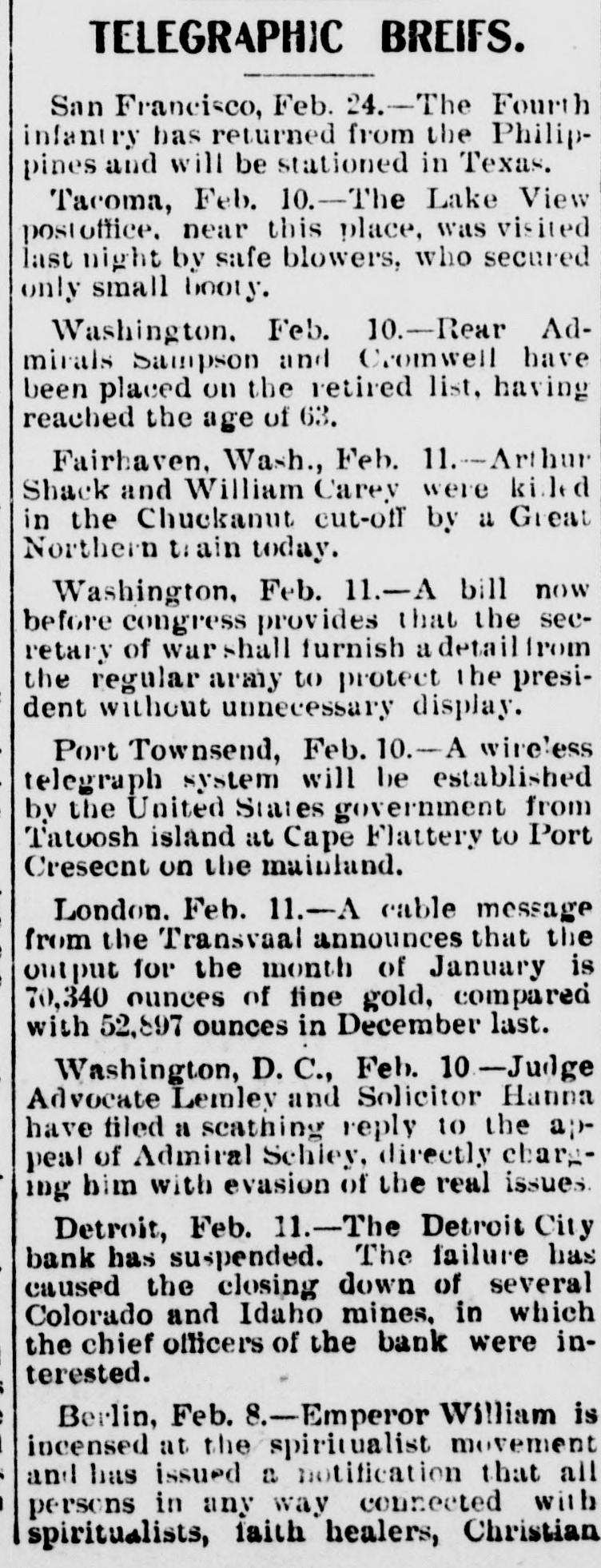 TELEGRAPHIC BREIFS. San Francisco, Feb. 24.-The Fourth infantry has returned from the Philippines and will be stationed in Texas. Tacoma, Feb. -The Lake View postoffice. near this place, was visited last night by safe blowers, who secured only small booty. Washington. Feb. .-Rear Admirals Sampson and Cromwell have been placed on the retired list, having reached the age of 63. Fairhaven, Wash., Feb. 11.-Arthur Shack and William Carey were killed in the Chuckanut cut-off by a Great Northern train today. Washington, Feb. 11.-A bill now before congress provides that the secretary of war shall furnish a detailfrom the regular army to protect the president without unnecessary display. Port Townsend, Feb. 10. - A wireless telegraph system will be established by the United States government from Tatoosh island at Cape Flattery to Port Cresect on the mainland. London. Feb. 11.-A cable message from the Transvaal announces that the output for the month of January is 70,340 ounces of tine gold, compared with 52,897 ounces in December last. Washington, D.C., Feb. -Judge Advocate Lemley and Solicitor Hanna have filed a scathing reply to the appeal of Admiral Schley, directly charging him with evasion of the real issues. Detroit, Feb. 11.-The Detroit City bank has suspended. The failure has caused the closing down of several Colorado and Idaho mines, in which the chief officers of the bank were interested. Berlin, Feb. 8.-Emperor William is incensed at the spiritualist movement and has issued a notification that all persons in any way connected with spiritualists, faith healers, Christian