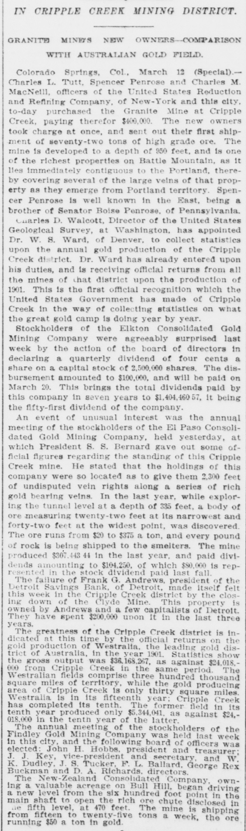IN CRIPPLE CREEK MINING DISTRICT. GRANITE MINEYS NEW OWNERSCOMPARISON WITH AUSTRALIAN GOLD FIELD. Colorado Springs, Col., March 12 (Special).Charles L. Tutt. Spencer Penrose and Charles M. MacNelll, officers of the United States Reduction and Refining Company, of New-York and this city, to-day purchased the Granite Mine at Cripple Creek, paying therefor $400,000. The new owners took charge at once, and sent out their first shipment of seventy-two tons of high grade ore. The mine is developed to a depth of 950 feet, and is one of the richest properties on Battle Mountain, as it lies immediately contiguous to the Portland, thereby covering several of the large veins of that property as they emerge from Portland territory. Spencer Penrose is well known in the East, being a brother of Senator Boise Penrose, of Pennsylvania. Charles D. Walcott, Director of the United States Geological Survey, at Washington, has appointed Dr. W. S. Ward, of Denver, to collect statistics upon the annual gold production of the Cripple Creek district. Dr. Ward has already entered upon his duties, and is receiving official returns from all the mines of that district upon the production of 1901. This is the first official recognition which the United States Government has made of Cripple Creek in the way of collecting statistics on what the great gold camp is doing year by year. Stockholders of the Elkton Consolidated Gold Mining Company were agreeably surprised last week by the action of the board of directors in declaring a quarterly dividend of four cents a share on a capital stock of 2,500,000 shares. The disbursement amounted to $100,000, and will be paid on March 20. This brings the total dividends paid by this company in seven years to $1,404,460 57, it being the fifty-first dividend of the company. An event of unusual interest was the annual meeting of the stockholders of the El Paso Consolidated Gold Mining Company, held yesterday, at which President S. S. Bernard gave out some official figures regarding the standing of this Cripple Creek mine. He stated that the holdings of this company were so located as to give them 2,300 feet of undisputed vein rights along a series of rich gold bearing veins. In the last year, while exploring the tunnel level at a depth of 335 feet, a body of ore measuring twenty-two feet at its narrowest and forty-two feet at the widest point, was discovered The ore runs from $20 to $375 a ton, and every pound of rock is being shipped to the smelters. The mine produced $307.44 in the last year, and paid dividends amounting to $104,250. of which $80,000 is represented in the stock dividend paid last fall. The failure of Frank G. Andrews, president of the Detroit Savings Bank, of Detroit, made itself felt this week in the Cripple Creek district by the closing down of the Clyde Mine. This property is owned by Andrews and a few capitalists of Detroit. They have spent $200,000 upon it in the last three years. The greatness of the Cripple Creek district is indicated at this time by the official returns on the gold production of Westralia, the leading gold district of Australia, in the year 1901. Statistics show the gross output was $36,168,267. as against $24,018.000 from Cripple Creek in the same period. The Westralian fields comprise three hundred thousand square miles of territory, while the gold producing area of Cripple Creek is only thirty square miles. Westralia is in its fifteenth year; Cripple Creek has completed its tenth. The former field in its tenth year produced only $5,344,041. as against $24,018.000 in the tenth year of the latter. The annual meeting of the stockholders of the Findley Gold Mining Company was held last week in this city, and the following board of officers was elected: John H. Hobbs, president and treasurer; J. J. Key, vice-president and secretary, and W. K. Dudley, J. S. Tucker, F. L. Ballard, George Rex Buckman and D. A. Richards, directors. The New-Zealand Consolidated Company, owning a valuable acreage on Bull Hill, began driving a new level from the six hundred foot point in the main shaft to open the rich ore chute disclosed in ne fifth level, at 470 feet. The mine is shipping from fifteen to twenty-five tons a week, the ore running $50 a ton in gold.