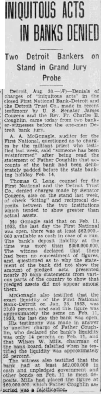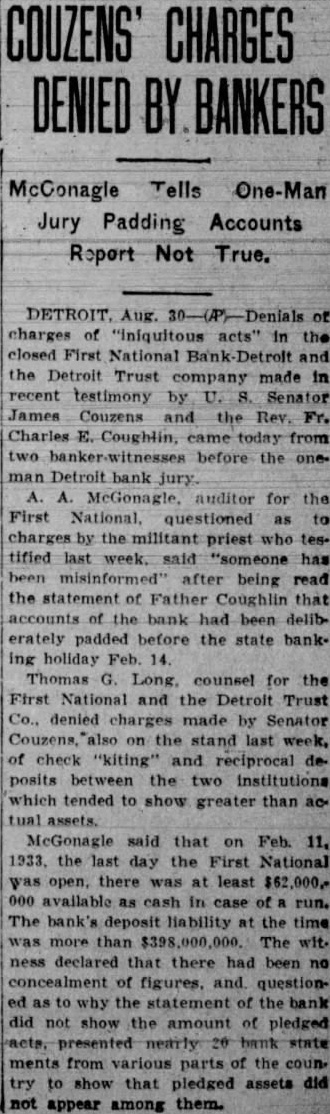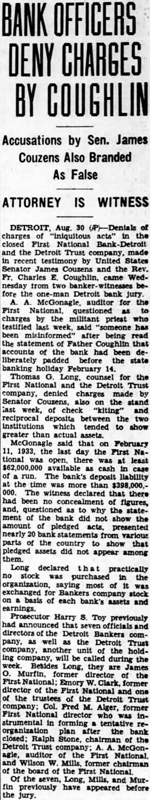 OFFICERS CHARGES BY COUGHLIN Accusations by Sen. James Couzens Also Branded As False ATTORNEY IS WITNESS DETROIT, Aug. 30 of charges "iniquitous closed First National and the Detroit Trust company, made recent testimony by United States James Couzens and the Rev. Charles Coughlin, came Wednesday two one-man Detroit bank jury. McGonagle, auditor for the First questioned charges by the militant priest testified week, being the Father that accounts the bank had deliberately padded before the state banking for the First Detroit Trust company, denied charges made by Senator the stand last week, of check "kiting" reciprocal deposits between the institutions which tended show greater than actual assets. that February 1933, the last day the First National was open, there was least $62,000,000 available cash The bank's deposit liability the time more than The witness declared that there been no concealment figures, questioned the statement the bank did not show amount of pledged acts, presented nearly from various parts the country show that pledged assets did not appear among Long declared practically stock purchased in saying most exchanged stock basis each bank's assets earnings. Prosecutor Harry Toy previously announced Detroit Bankers company, the Detroit Trust another ing company, will during Besides Long, they James former director Emory Clark, former director the First National the trustees of the Detroit Trust company; Fred Alger, former director strumental in forming tentative replan after the closed: Ralph Stone, Detroit Trust auditor First Wilson chairman the board the First the Long, Mills, Murand previously appeared before jury.