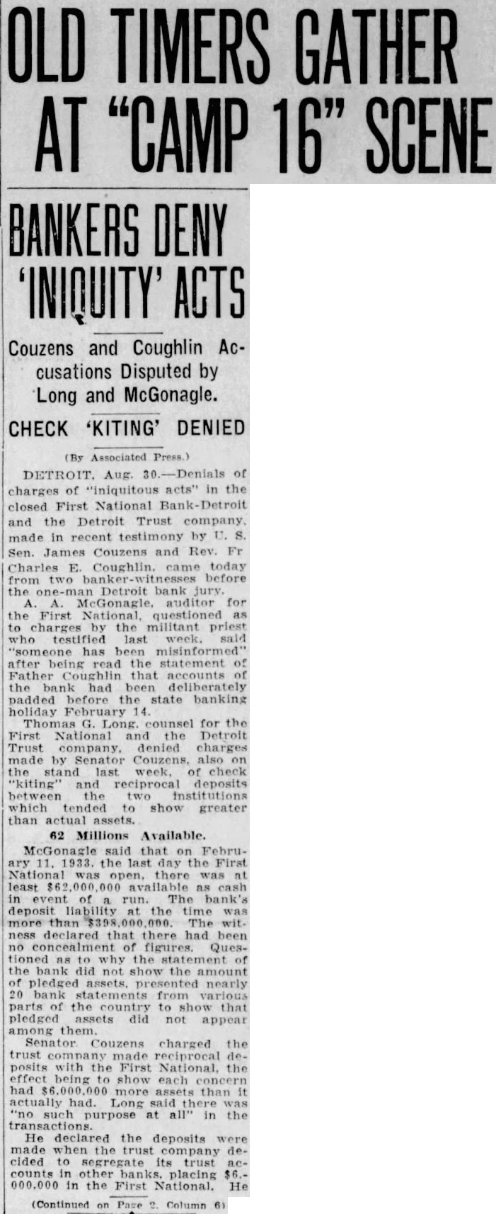 OLD TIMERS GATHER AT "CAMP 16" SCENE BANKERS DENY Couzens and Coughlin Accusations Disputed by Long and McGonagle. CHECK 'KITING' DENIED (By Associated Press.) DETROIT. Aug. 30.-Denials of charges of "iniquitous acts" in the closed First National and the Detroit Trust company made in recent testimony by U. Sen. James Couzens and Rev. Fr Charles today from before the Detroit bank auditor for the First National, questioned to charges the militant priest testified last after read the statement Father that accounts the bank had been deliberately padded before state banking holiday February Thomas G. for the First National Detroit Trust denied charges made by Senator also the stand last check "kiting" and reciprocal deposits between the which tended show greater than assets. 62 Millions Available. McGonagle that Februday the First there was least in event run. The deposit liability the time more than The ness declared that there had been no figures. Questioned the the bank did show the amount pledged nearly from parts the country show that pledged assets not appear among charged the trust made posits with the First the being show each had more actually had. Long said "no purpose at in the declared the deposits when trust company decided to segregate its trust counts in banks. placing 000.000 in the First National. He (Continued Page Column