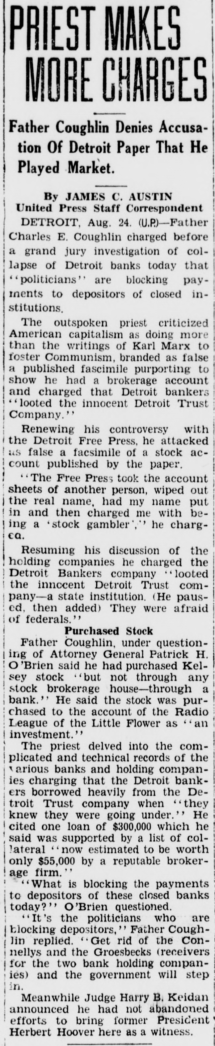 PRIEST MAKES MORE CHARGES Father Coughlin Denies Accusation Of Detroit Paper That He Played Market. By JAMES C. AUSTIN United Press Staff Correspondent DETROIT, Aug. 24. (U.P)-Father Charles E. Coughlin charged before a grand jury investigation of collapse of Detroit banks today that "politicians" are blocking payments to depositors of closed institutions, The outspoken priest criticized American capitalism as doing more than the writings of Karl Marx to foster Communism, branded as false a published fascimile purporting to show he had a brokerage account and charged that Detroit bankers looted the innocent Detroit Trust Company. Renewing his controversy with the Detroit Free Press, he attacked as false a facsimile of a stock account published by the paper. The Free Press took the account sheets of another person, wiped out the real name, had my name put in and then charged me with being a 'stock gambler`," he chargca. Resuming his discussion of the holding companies he charged the Detroit Bankers company "looted the innccent Detroit Trust company-a state institution. (He paused, then added) They were afraid of federals." Purchased Stock Father Coughlin, under questioning of Attorney General Patrick H. O 'Brien said he had purchased Kelsey stock 'but not through any stock brokerage house-through a bank." He said the stock was purchased to the account of the Radio League of the Little Flower as 'an investment.' The priest delved into the complicated and technical records of the arious banks and holding companies charging that the Detroit bankers borrowed heavily from the Detroit Trust company when "they knew they were going under." He cited one loan of $300,000 which he said was supported by a list of collateral "now estimated to be worth only $55,000 by a reputable brokerage firm." 'What is blocking the payments to depositors of these closed banks today?'' O'Brien questioned. "It's the politicians who are blocking depositors, Father Coughlin replied. Get rid of the Connellys and the Groesbecks (receivers for the two bank holding companies) and the government will step in. Meanwhile Judge Harry B. Keidan announced he had not abandoned efforts to bring former President Herbert Hoover here as a witness.