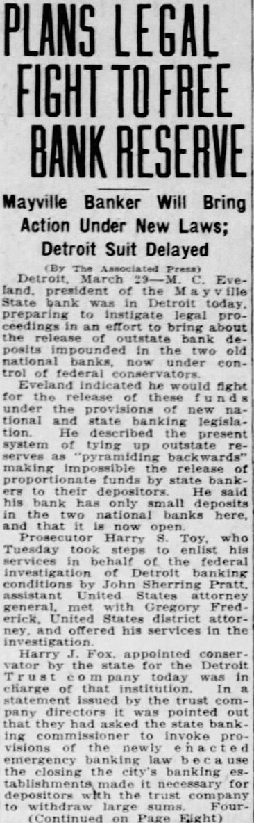 PLANS LEGAL FIGHT TO FREE BANK RESERVE Mayville Banker Will Bring Action Under New Laws; Detroit Suit Delayed Press) Eveof the State bank Detroit today, preparing to instigate legal proceedings an effort bring about the release bank deposits in the national banks, now under control of federal conservators. fight the of under the new tional and state legislation. He described present system of tying outstate reas making the release of funds by state ers He said his bank only deposits in two national banks here, and that now Harry who Tuesday took steps to enlist his services in of the federal of Detroit conditions Pratt, assistant United States general, met with Gregory Frederick, United States district attorand offered his services in the Harry appointed conserby the for the Detroit today was in charge of that institution. In issued by the trust company was pointed out that they had asked the state bank. invoke visions the emergency use the closing the banking esfor depositors the trust company to withdraw Four(Continued on Page Eight)