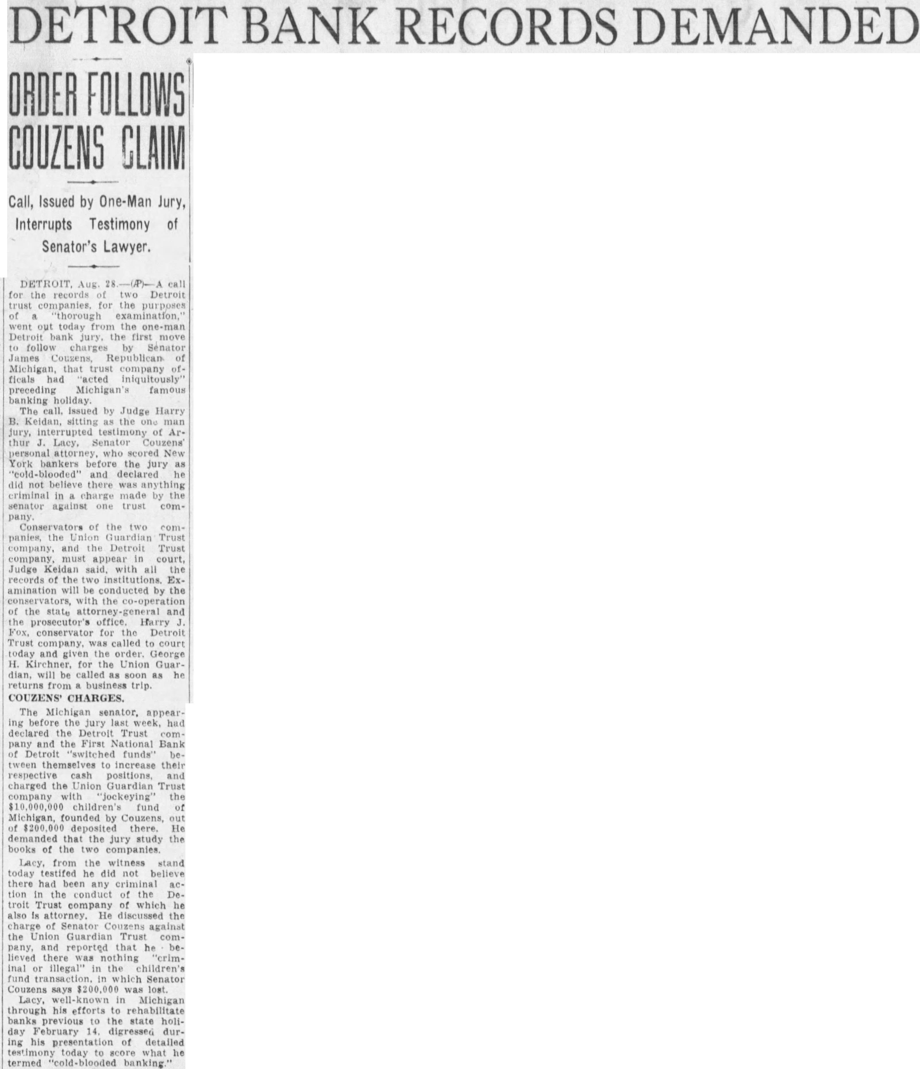 DETROIT BANK RECORDS DEMANDED FOLLOWS COUZENS CLAIM Call, Issued by One-Man Jury, Interrupts Testimony of Senator's Lawyer. for the records two Detroit the purposes went out today the Detroit jury, the first move follow charges Senator James Republican of Michigan, that trust company ficals iniquitously' preceding Michigan's famous banking holiday. The call. Issued by Judge Harry B. Keidan, sitting the jury, interrupted testimony of thur Lacy, Senator scored New York bankers before the jury and declared did not believe there was criminal in charge made by senator against company Conservators of two companies, the Union Guardian Trust company, and the Detroit Trust company, must appear in court, Judge Keidan with all the records of the two institutions. Ex. amination will be conducted by the conservators with the of the state attorney and prosecutor's office Harry Fox, conservator for the Detroit Trust company, was called to court today and given the order. George H. Kirchner, for the Union Guar dian, be called as soon as returns business trip. COUZENS' CHARGES. The Michigan senator, appearing before the jury last week, had declared the Detroit Trust comand the First National Bank Detroit funds" between to increase their respective cash positions, charged the Union Guardian Trust company 'jockeying' the $10,000,000 children's fund of Michigan, founded by Couzens, out of deposited there. He demanded that the jury study the books of the two companies. Lacy, from the witness stand today testifed he did not believe there had been any criminal tion the conduct the Detroit Trust company of which he also attorney. He discussed the charge of Senator against the Union Guardian Trust company, and reported he bethere was "criminal or illegal" the children's fund which Senator Couzens says $200,000 was lost. Lacy, well-known in Michigan through his efforts rehabilitate banks previous to the state holiday February 14, digressed during his presentation of detailed testimony today to what he termed banking.
