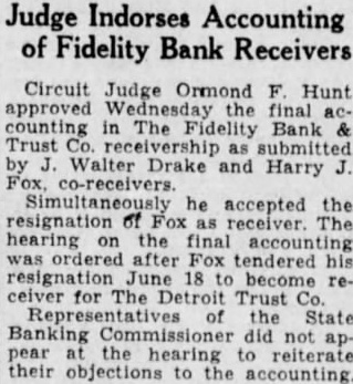Judge Indorses Accounting of Fidelity Bank Receivers Circuit Judge Ormond F. Hunt approved Wednesday the final accounting in The Fidelity Bank & Trust Co. receivership as submitted by J. Walter Drake and Harry J. Simultaneously he accepted the resignation of Fox as receiver. The hearing on the final accounting was ordered after Fox tendered his resignation June 18 to become receiver for The Detroit Trust Co. of the State Banking Commissioner did not appear at the hearing to reiterate their objections to the accounting.