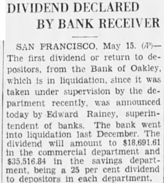 DIVIDEND DECLARED BY BANK RECEIVER SAN FRANCISCO. May 15. The first dividend return to depositors. from the Bank of Oakley, which is in liquidation, it was taken under supervision the department recently. announced today by Edward Rainey, superintendent of banks bank went last will to the and the savings department. being 25 per dividend to depositors in each department.