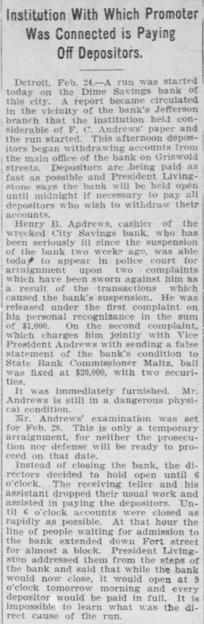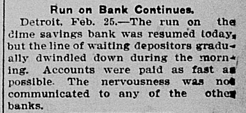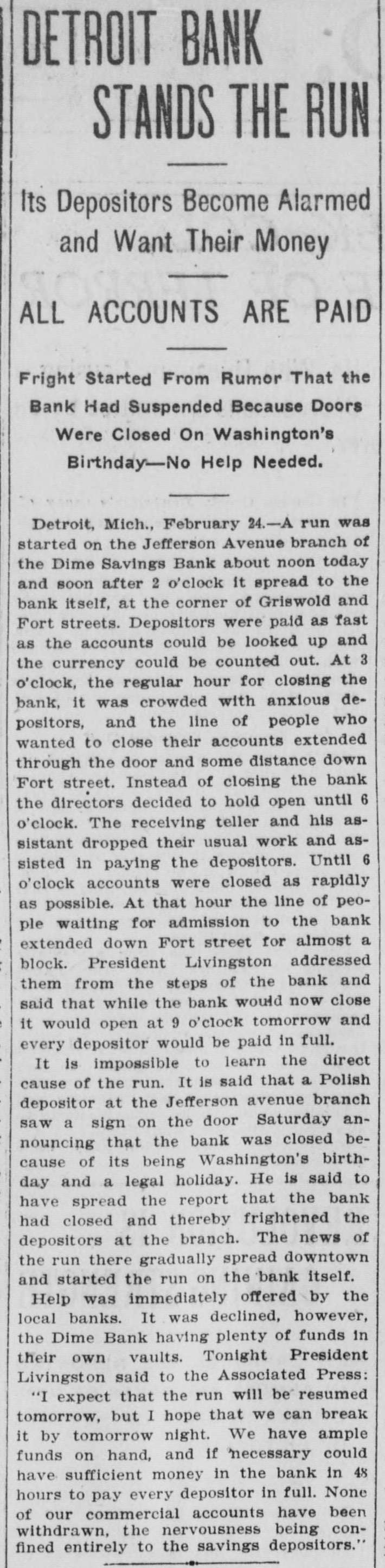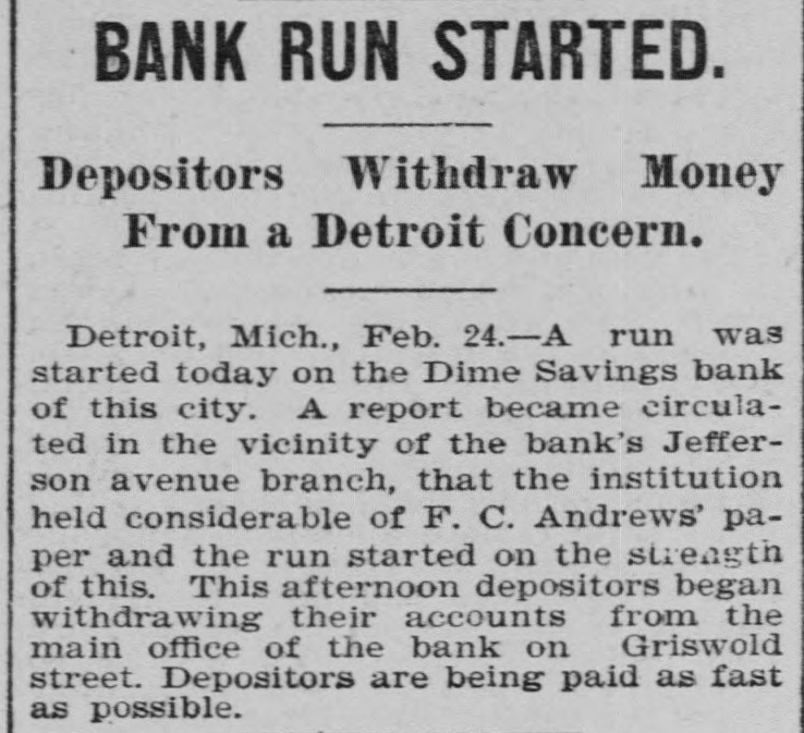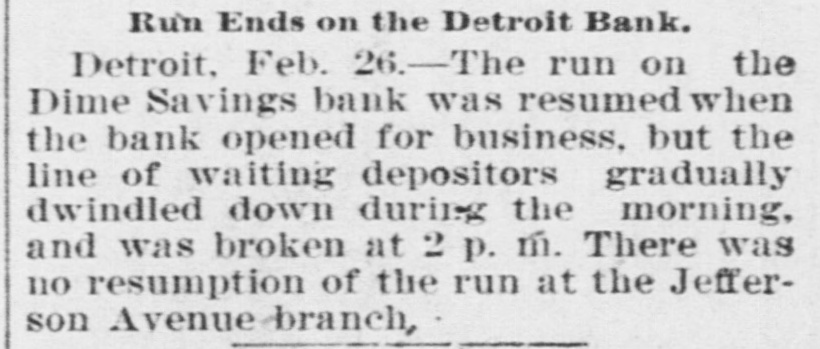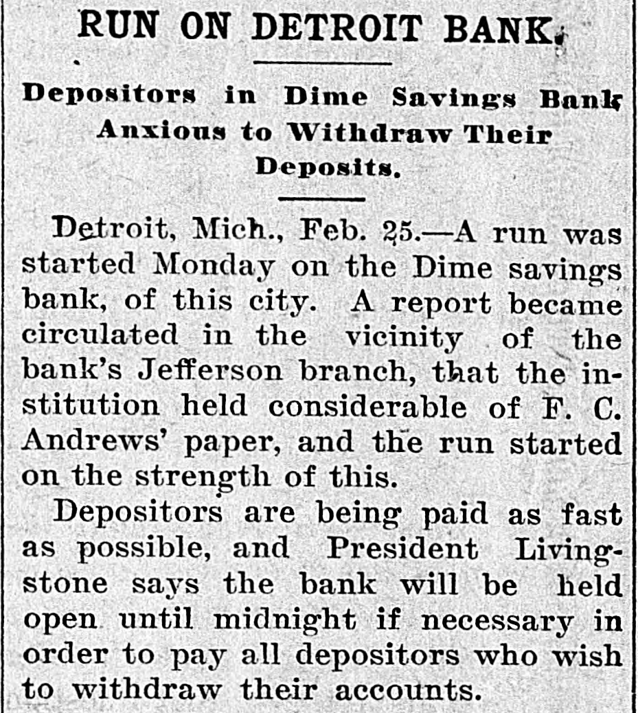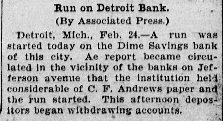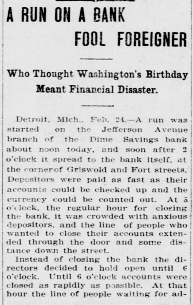 A run on the Dime Savings bank at Detroit was caused by a groundless rumor that it had failed.