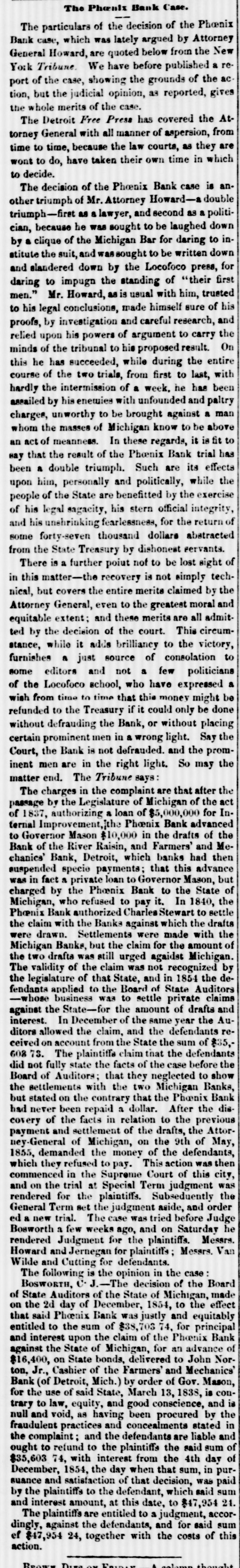 The Phonex Bank Case. The particulars of the decision of the Phoenix Bank case, which was lately argued by Attorney General Howard, are quoted below from the New York Tribune. We have before published a report of the case, showing the grounds of the ac tion, but the judicial opinion, as reported, gives the whole merits of the case. The Detroit Free Press has covered the Attorney General with all manner of aspersion, from time to time, because the law courts, as they are wont to do, have taken their own time in which to decide. The decision of the Phoenix Bank case is another triumph of Mr. Attorney Howard-a double triumph-firet as a lawyer, and second as a politician, because he was sought to be laughed down by a clique of the Michigan Bar for daring to institute the suit, and sought to be written down and slandered down by the Locofoco press, for daring to impugn the standing of "their first men." Mr. Howard, as is usual with him, trusted to his legal conclusions, made himself sure of his proofs, by investigation and careful research, and relied upon his powers of argument to carry the minds of the tribunal to his proposed result. On this he has succeeded, while during the entire course of the two trials, from first to last, with hardly the intermission of a week, he has been assailed by his enewies with unfounded and paltry charges, unworthy to be brought against a man whom the masses of Michigan know to be above an act of meanness. In these regards, it is fit to say that the result of the Phoenix Bank trial has been a double triumph. Such are its effects upon him, personally and politically, while the people of the State are benefitted by the exercise of his legal sagacity, his stern official integrity, and his unshrinking fearlessness, for the return of some forty-seven thousand dollars abstracted from the State Treasury by dishonest servants. There is a further point not to be lost sight of in this matter-the recovery is not simply technical, but covers the entire merits claimed by the Attorney General, even to the greatest moral and equitable extent; and these merits are all admitted by the decision of the court. This circumstance, while it adds brilliancy to the victory, furnishes a just source of consolation to some editors and not a few politicians of the Locofoco school, who have expressed a wish from time to time that this money might be refunded to the Treasury if it could only be done without defrauding the Bank, or without placing certain prominent men in a wrong light. Say the Court, the Bank is not defrauded. and the prominent men are in the right light. So may the matter end. The Tribune says: The charges in the complaint are that after the passage by the Legislature of Michigan of the act of 1837, authorizing a loan of $5,000,000 for Internal Improvement,Ithe Phoenix Bank advanced to Governor Mason $10,000 in the drafts of the Bank of the River Raisin, and Farmers' and Mechanics' Bank, Detroit, which banks had then suspended specio payments; that this advance was in fact a private loan to Governor Mason, but charged by the Phoenix Bank to the State of Michigan, who refused to pay it. In 1840, the Phonix Bank authorized Charles Stewart to settle the claim with the Banks against which the drafts were drawn. Settlements were made with the Michigan Banks, but the claim for the amount of the two drafts was still urged agaidst Michigan. The validity of the claim was not recognized by the legislature of that State, and in 1854 the defendants applied to the Board of State Auditors -whose business was to settle private claims against the State-for the amount of drafts and interest. In December of the same year the Auditors allowed the claim, and the defendants received on account from the State the sum of $35,603 73. The plaintiffs claim that the defendants did not fully state the facts of the case before the Board of Auditors; that they neglected to show the settlements with the two Michigan Banks, but stated on the contrary that the Phoenix Bank had never been repaid a dollar. After the discovery of the facts in relation to the previous payment and settlement of the drafts, the Attorney-General of Michigan, on the 9th of May, 1855, demanded the money of the defendants, which they refused to pay. This action was then commenced in the Supreme Court of this city, and on the trial at Special Term judgment was rendered for the plaintiffs. Subseduently the General Term set the judgment aside, and order ed a new trial. The case was tried before Judge Bosworth a few weeks ago, and on Saturday he rendered Judgment for the plaintiffs. Messrs. Howard and Jernegan for plaintiffs; Messrs. Van Wilde and Cutting for defendants. The following is the opinion in the case Bosworth, C. J.-The decision of the Board of State Auditors of the State of Michigan, made on the 2d day of December, 1854, to the effect that said Phoenix Bank was justly and equitably entitled to the sum of $38, 703 74, for principal and interest upon the claim of the Phoenix Bank against the State of Michigan, for an advance of $16,400, on State bonds, delivered to John Norton, Jr., Cashier of the Farmers' and Mechanics' Bank (of Detroit, Mich.) by order of Gov. Mason, for the use of said State, March 13, 1838, is contrary to law, equity, and good conscience, and is null and void, as having been procured by the fraudulent practices and concealments stated in the complaint; and the defendants are liable and ought to refund to the plaintiffs the said sum of $35,603 74, with interest from the 4th day of December, 1854, the day when that sum, in pursuance and satisfaction of that decision, was paid by the plaintiffs to the defendant, which said sum and interest amount, at this date, to $47,954 24. The plaintiffs are entitled to a judgment, accordingly, against the defendants, and for said sum ef $47,954 24, together with the costs of this action. BROWN Durs ex FRIDAY thought