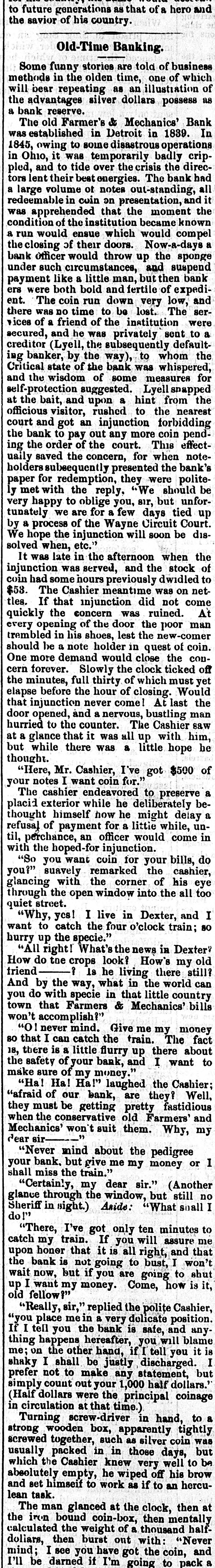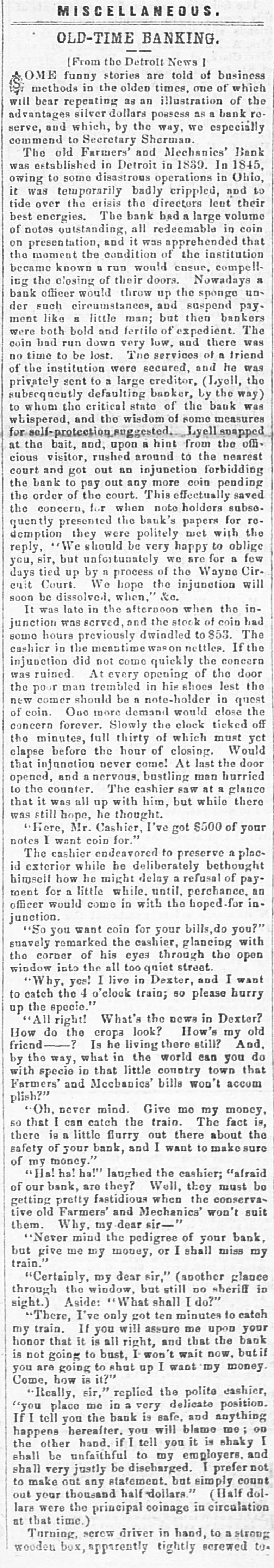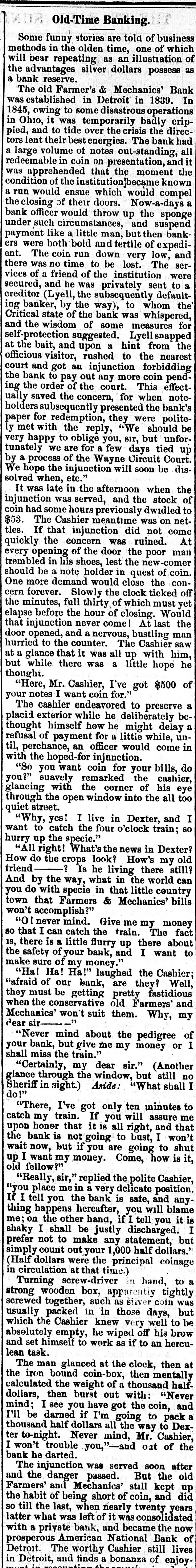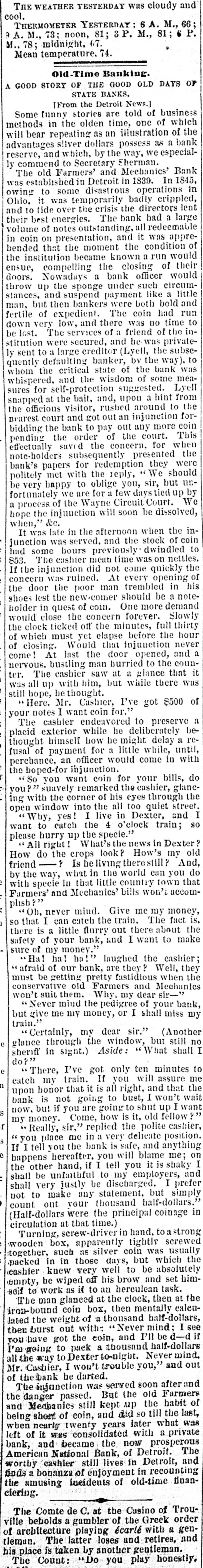 Tne WEATHER YESTERDAY was cloudy and cool. THERMOMETER YESTERDAY 6 A. M., 66 9 A. M., 73: noon, 81; 3P. M., 81; M., 78; midnight, 67 Mean temperature. 74. Old-Time Banking. A GOOD STORY OF THE GOOD OLD DAYS OF STATE BANKS. [From the Detroit News.] Some funny stories are told of business methods in the olden time, one of which will bear repeating as an illustration of the advantages silver dollars possess as a bank reserve, and which, by the way, we especially commend to Secretary Sherman. The old Farmers' and Mechanics' Bank was established in Detroit in 1839. In 1845, owing to some disastrous operations in Ohio. it was temporarily badly crippled, and to tide over the erisis the directors lent their best energies. The bank had a large volume of notes outstanding, all redeemable in coin on presentation, and it was apprebended that the moment the condition of the institution became known a run would ensue, compelling the closing of their doors. Nowadays a bank officer would throw up the sponge under such circumstances, and suspend payment like a little man, but then bankers were both bold and fertile of expedient. The coin had run down very low, and there was no time to be lost. The services of a friend of the institution were secured, and he was privately sent to a large creditor (Lyell, the subscquently defaulting banker, by the way). to whom the critical state of the bank was whispered, and the wisdom of some measures for self-protection suggested. Lyell snapped at the bait, and, upon a hint from the officious visitor, rushed around to the nearest court and got out an injunction forbidding the bank to pay out any more coin pending the order of the court. This effectually saved the concern, for when note-holders subsequently presented the bank's papers for redemption they were politely met with the reply, " We should be very happy to oblige you, sir, but unfortunately we are for few daystied up by a process of the Wayne Circuit Court. We hope the injunction will soon be dissolved, when," &c. It was late in the afternoon when the injunction was served, and the stock of coin had some hours previously dwindled to 853. The cashier mean time was on nettles. the injunction did not come quickly the concern was ruined. At every opening of the door the poor man trembled in his shoes lest the new-comer should be a noteholder in quest of coin. One more demand would close the concern forever. Slowly the clock ticked off the minutes, full thirty of which must yet elapse before the hour of closing. Would that injunction never come At last the door opened, and nervous. bustling man burried to the counter. The cashier saw at a glance that it was all up with him, but while there was hope, be thought. Here, Mr. Cashier, I've got 8500 of your notes I want coin for." The cashier endeavored to preserve a placid exterior while he deliberately bethought bimself how he might delay a refusal of payment for a little while, until, perchance, an officer would come in with the boped-for injunction. So you want coin for your bills, do vou? suavely remarked the cashier, glancing with the corner of his eyes through the open window into the all too quiet street. Why, yes! I live in Dexter, and want to catch the 4 o'clock train; so please hurry up the specie." All right What's the news in Dexter How do the crops look? How's my old friend -? Is he living there still And, by the way, what in the world can you do with specie in that little country town that Farmers' and Mechanics' bills won't accomplish?" Oh, never mind. Give me my money, so that I can catch the train. The fact is. there is a little flurry out there about the safety of your bank, and I want to make sure of my money.' Ha! ha! ha laughed the cashier: afraid of our bank, are they ? Well, they must be getting pretty fastidious when the conservative old Farmers and Mechanics won'tsuit them. Why, my dear sir-' Never mind the pedigree of your bank, but give me my money, or I shall miss my train." Certainly, mv dear sir." (Another glance through the window, but still no sheriff in sight.) Aside: What shall I do?" There, I've got only ten minutes to catch my train. If you will assure me upon honor that it is all right, and that the bank is not going to bust, I won't wait now. but if you are going to shut up want my money. Come, how is it, old fellow Really, sir,' replied the polite cashier, " you place me in very delicate position. If I tell you the bank is safe, and anything happens hereafter, you will blame me; on the other hand, if I tell you it is shaky shall be unfaithful to my employers, and shall very justly be discharged. I prefer not to make any statement, but simply count out your thousand half-dollars. (Half-dollars were the principal coinage in circulation at that time.) Turning, screw-driver in hand. to strong :wooden box, apparently tightly screwed together, such as silver coin was usually packed in in those days, but which the eashier knew very well to be absolutely empty, be wiped off his brow and set himscif to work as if to an hereulean task. The man glaneed at the clock. then at the iron-bound coin box, then mentally ealeulated the weight of a thousand half-dollars, then burst out with: Never mind: see you have got the coin, and I'll d-d I'm going to pack a thousand half-dollars all the way to Dexter to-night. Never mind, Mr. Cashier, I won't trouble you,' and out of the bank he darted. The injunction was served soon after and the danger passed. But the old Farmers and Mechanics still kept up the habit of being short of coin, and did so till the last, when nearly twenty years later what was left of It was consolidated with a private bank, and became the now prosperous American National Bank, of Detroit. The worthy cashier still lives in Detroit, and finds a bonanza of enjoyment in recounting the amusing incidents of old-time tinanefering. The Comte de C. at the Cusino of Trouville beholds a gambler of the Greek order of architecture playing écari