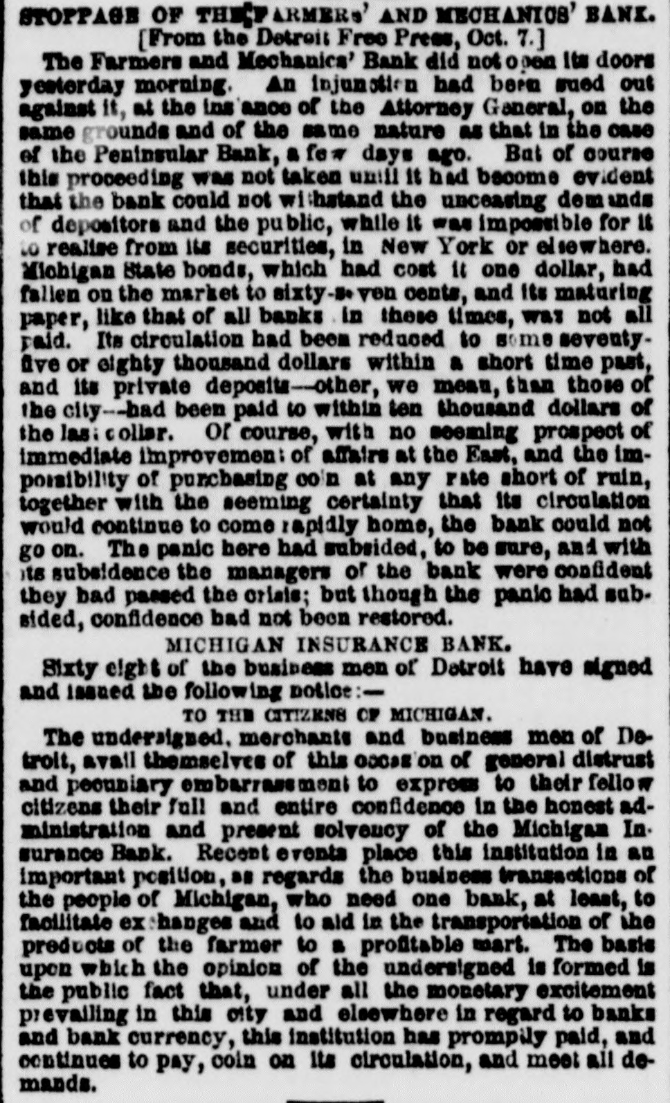 STOPPAGE OF THE'F ARMERS' AND MECHANICS' BANK. [From the Detroit Free Press, Oct. 7.] The Farmers and Mechanics' Bank did not open Its doors yesterday morning. An injunstion had been sued out against it, at the ins ance of the Attorney General, on the same grounds and of the same nature as that in the case of the Peninsular Bank, a few days ago. But of course this proceeding was not taken un!!! it had become evident that the bank could not withstand the unceasing ands of depositors and the public, while it was impossible for it to realise from its securities, in New York or elsewhere. Michigan State bonds, which had cost it one dollar, had fallen on the market to sixty-s+ ven cents, and its maturing paper, like that of all banks in these times, was not all paid. Its circulation had been reduced to some seventyfive or eighty thousand dollars within a short time past, and its private deposits-other, we meau, than those of the city-bad been paid to within ten thousand dollars of the las: collar. or course, with no seeming prospect of immediate improvement of affairs at the East, and the impossibility of purchasing coin at any rate short of ruin, together with the seeming certainty that its circulation would continue to come rapidly home, the bank could not go on. The panic here had subsided, to be sure, and with its subsidence the managers or the bank were confident they bad passed the crisis; but though the panic had subsided, confidence bad not been restored. MICHIGAN INSURANCE BANK. Sixty eight of the business men of Detroit have signed and issued the following notice:TO THE CITIZENS OF MICHIGAN. The undersigned, merchants and business men of Detroit, avail themselves of this occasion of general distrust and pecusiary embarrassment to express to their fellow citizens their full and entire confidence in the honest administration and present solvency of the Michigan Insurance Bank. Recent events place this institution in an important position, as regards the business transactions of the people of Michigan, who need one bank, at least, to facilitate ex hanges and to aid in the transportation of the preducts of the farmer to a profitable mart. The basis upon which the opinion of the undersigned is formed is the public fact that, under all the monetary excitement prevailing in this city and elsewhere in regard to banks and bank currency, this institution has promptly paid, and continues to pay, coin on its circulation, and meet all demands.