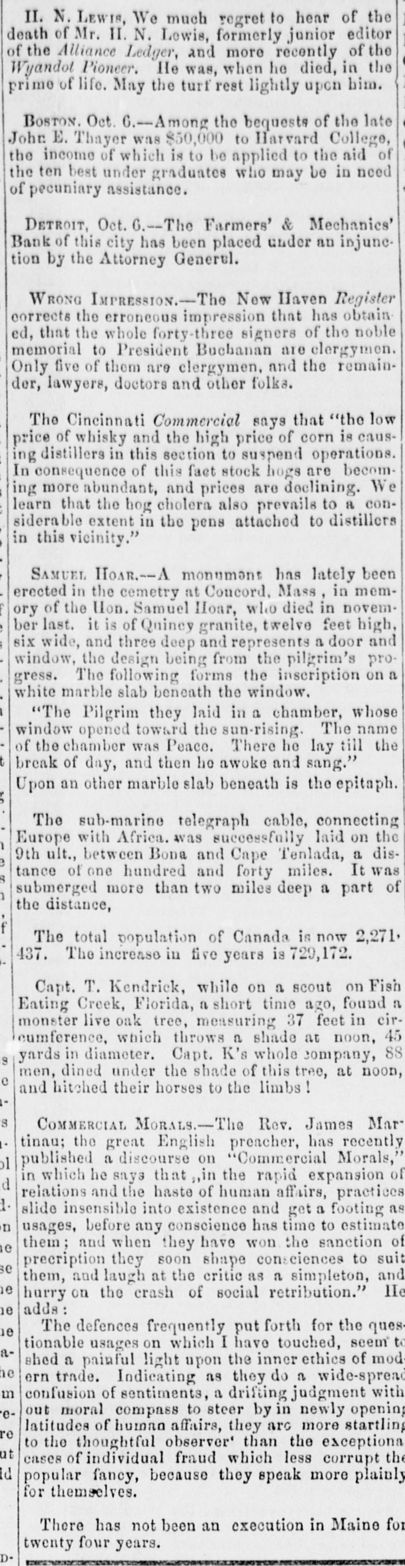 II. N. LEWIS, We much regret to hear of the death of Mr. II. N. Lewis, formerly junior editor of the Alliance Ledger, and more recently of the Wyandot Pioneer. He was, when he died, in the prime of life. May the turf rest lightly upon him. BOSTON. Oct. 6.-Among the bequests of the late John E. Thayer was $50,000 to Harvard College, the income of which is to be applied to the aid of the ten best under graduates who may be in need of pecuniary assistance. DETROIT, Oct. 6.-The Farmers' & Mechanics' Bank of this city has been placed under an injunetion by the Attorney Generul. WRONG IMPRESSION.-The New Haven Register corrects the erroncous impression that has obtain ed, that the whole forty-three signers of the noble memorial to President Buchanan are clergymen. Only five of them are clergymen, and the remainder, lawyers, doctors and other folks. The Cincinnati Commercial says that "the low price of whisky and the high price of corn is causing distillers in this section to suspend operations. In consequence of this fact stock hogs are becoming more abundant, and prices are declining. We learn that the hog cholera also prevails to a considerable extent in the pens attached to distillers in this vicinity." SAMUEL HOAR.--A monument has lately been erected in the cemetry at Concord, Mass, in memory of the Hon. Samuel Hoar, who died in november last. it is of Quincy granite, twelve feet high, six wide, and three deep and represents a door and window, the design being from the pilgrim's progress. The following forms the inscription on a white marble slab beneath the window. "The Pilgrim they laid in a chamber, whose window opened toward the sun-rising. The name of the chamber was Peace. There he lay till the break of day, and then he awoke and sang." Upon an other marble slab beneath is the epitaph. The sub-marine telegraph cable, connecting Europe with Africa. was successfully laid on the 9th ult., between Bona and Cape Tenlada, a distance of one hundred and forty miles. It was submerged more than two miles deep a part of the distance, The total population of Canada is now 2,271. 437. The increase in five years is 729,172. Capt. T. Kendrick, while on a scout on Fish Eating Creek, Florida, a short time ago, found a monster live oak tree, measuring 37 feet in circumference, which throws a shade at noon, 45 yards in diameter. Capt. K's whole company, 88 men, dined under the shade of this tree, at noon, e and hitched their horses to the limbs ! S COMMERCIAL Morals.-The Rev. James Martinau; the great English preacher, has recently published a discourse on "Commercial Morals,' in which he says that ,,in the rapid expansion of d relations and the haste of human affairs, practices 1. slide insensible into existence and get a footing as n usages, before any conscience has time to estimate them; and when they have won the sanction of e precription they soon shape consciences to suit se them, and laugh at the critic as a simpleton, and e hurry on the crash of social retribution." He adds: 1e The defences frequently put forth for the ques 10 tionable usages on which I have touched, seem® to 8shed a painful light upon the inner ethics of mod 1e ern trade. Indicating as they do a wide-spread m confusion of sentiments, a drifting judgment with out moral compass to steer by in newly opening elatitudes of human affairs, they arc more startling re to the thoughtful observer' than the exceptiona ut cases of individual fraud which less corrupt the Id popular fancy, because they speak more plainly for themselves. There has not been an execution in Maine for twenty four years.