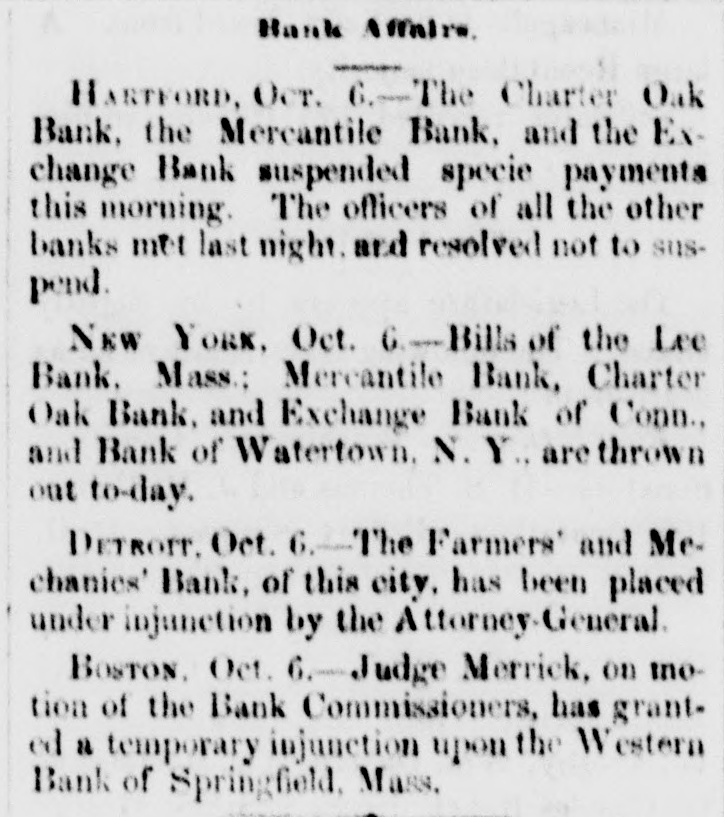 Bank Affairs. HARTFORD, Oct. 6.-The Charter Oak Bank, the Mercantile Bank, and the Exchange Bank suspended specie payments this morning. The officers of all the other banks met last night. and resolved not to suspend. NEW YORK, Oct. G.-Bills of the Lee Bank. Mass.: Mercantile Bank, Charter Oak Bank. and Exchange Bank of Conn., and Bank of Watertown. N.Y., are thrown out to-day. DETROIT. Oct. 6.-The Farmers' and Mechanics' Bank, of this city, has been placed under injunction by the Attorney-General. BOSTON. Oct. 6.-Judge Merrick, on motion of the Bank Commissioners, has granted a temporary injunction upon the Western Bank of Springfield, Mass.
