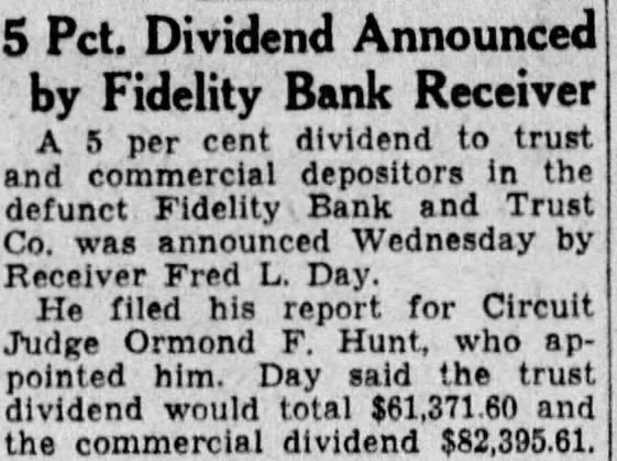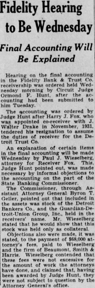 Fidelity Hearing to Be Wednesday Final Accounting Will Be Explained Hearing on the final accounting in the Fidelity Bank Trust ordered held Wednesday by Circuit Judge Ormond Hunt, after counting had been submitted to him The accounting was ordered by Judge Hunt after Harry Fox appointed co-receiver with Walter Drake in tendered his resignation assume the duties receiver for the Detroit Trust An explanation of certain items the final made Wednesday by Paul attorney Receiver Fox. This. Judge Hunt pointed out, was made by informal objections the on the part of the State Banking The Commissioner, through Assistant Attorney General Byron Geller, pointed out that included in the assets stock the Detroit Bankers and the Group, Inc., held in the receivers' name. Wieselberg stated that he would that this stock was held only as collateral Objections were made, was stated, to the payment of $68,000 torney's fees, paid to Wieselberg and the firm Beaumont, Smith Harris. contended that these fees were not excessive for the amount of work the attorneys have done, claimed having been awarded by Judge Hunt. they were subject to question by the Attorney General's office.