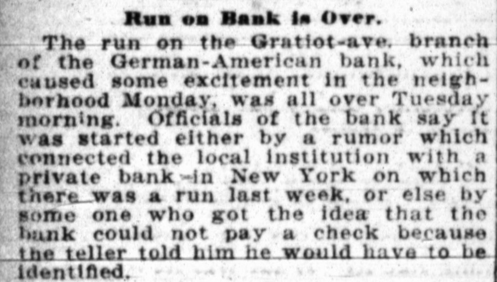 Run on Bank is Over. The run on the Gratiot-ave. branch of the German-American bank, which caused some excitement in the neighborhood Monday, was all over Tuesday morning. Officials of the bank say It was started either by a rumor which connected the local institution with a private bank -in New York on which there was a run last week, or else by some one who got the idea that the bank could not pay a check because the teller told him he would have to be identified.