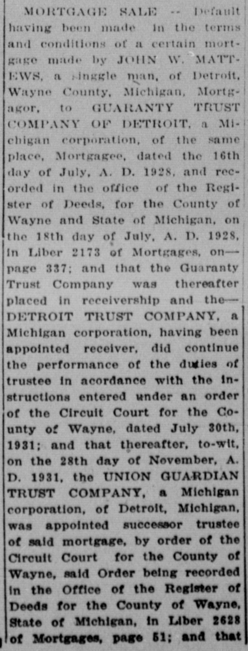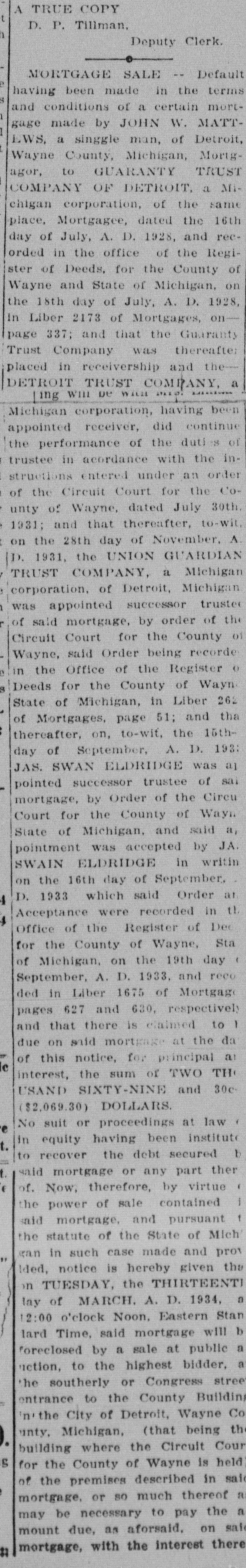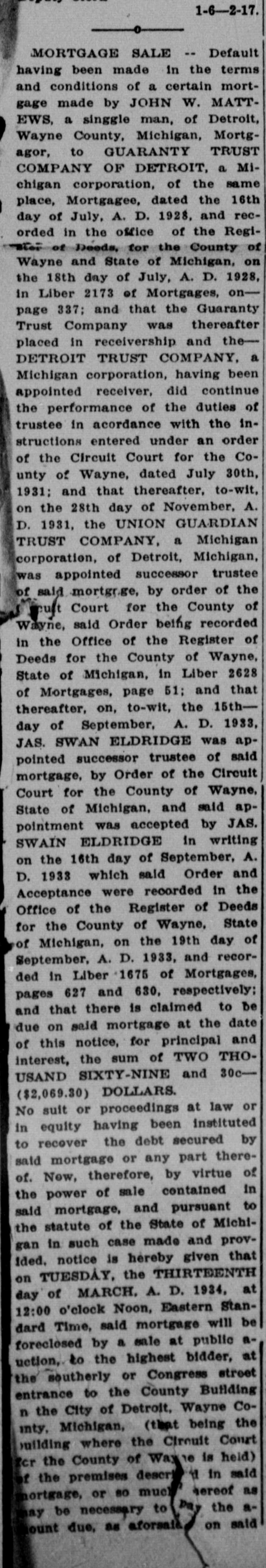day of July, A. D. 1928, and recorded in the office of the Register of Deeds, for the County of Wayne and State of Michigan, on the 18th day of July, A. D. 1928, in Liber 2173 of Mortgages, on--page 337; and that the Guaranty Trust Company was thereafter placed in receivership and theDETROIT TRUST COMPANY, a Michigan corporation, having been appointed receiver, did continue the performance of the duties of trustee in acordance with the instructions entered under an order of the Circuit Court for the County of Wayne, dated July 30th, 1931; and that thereafter, to-wit, on the 28th day of November, A. D. 1931, the UNION GUARDIAN TRUST COMPANY, a Michigan corporation, of Detroit, Michigan, was appointed successor trustee of said mortgage, by order of the Circuit Court for the County of Wayne, said Order being recorded in the Office of the Register of Deeds for the County of Wayne State of Michigan, in Liber 2621 of Mortgages, page 51; and tha thereafter, on, to-wit, the 16thday of September, A. D. 1933 JAS. SWAN ELDRIDGE was ap pointed successor trustee of said mortgage, by Order of the Circuit Court for the County of Wayne, State of Michigan, and said appointment was accepted by JAS. SWAIN ELDRIDGE in writing on the 16th day of September, A. D. 1933 which said Order and Acceptance were recorded in the Office of the Register of Deeds for the County of Wayne, State of Michigan, on the 19th day of September, A. D. 1933, and recorded in Liber 1675 of Mortgages, pages 627 and 630, respectively: and that there is claimed to be due on said mortgage at the date of this notice, for principal and interest, the sum of TWO THOUSAND SIXTY-NINE and 30c($2,069.30) DOLLARS. No suit or proceedings at law or in equity having been instituted to recover the debt secured by said mortgage or any part thereof. Now, therefore, by virtue of the power of sale contained in said mortgage, and pursuant to the statute of the State of Michigan in such case made and provIded. notice is hereby given that on TUESDAY, the THIRTEENTH day of MARCH. A. D. 1934, at 12:00 o'clock Noon, Eastern Standard Time, said mortgage will be foreclosed by a sale at public auction, to the highest bidder, at the southerly or Congress street entrance to the County Building n the City of Detroit, Wayne Cointy. Michigan, (that being the building where the Circuit Court for the County of Wayne is held) of the premises described in said mortgage, or so much thereof as may be necessary to pay the amount due, as aforsaid, on said mortgage, with the Interest thereon at seven percent (7%) and all legal costs, charges and expenses., including the attorney fees allowed by law, and also any sum or sums which may be paid by the mortgagee, necessary to protect his interest in the premises. Which said premises are described as follows: All that certain piece or parcel of land situato in the City of Detroit, in the County of Wayne and State of Michigan, and described as follows, to-wit: Lot numbered One Hundred Sixty-three (163) HANNAN'S "BELT LINE ADDITION" being part of Private Claim 678, as recorded in ne County, Michigan, Records. Dated at Detroit, Michigan, December 13th, 1933. Jas. Swan Eldridge,' Assignee - Mortgagee. 12-23-1983. Jas. Swan Eldridge,