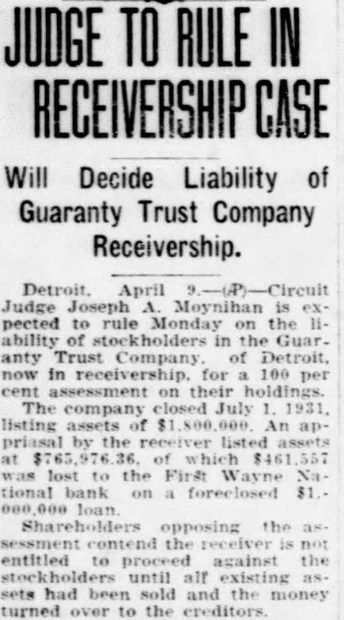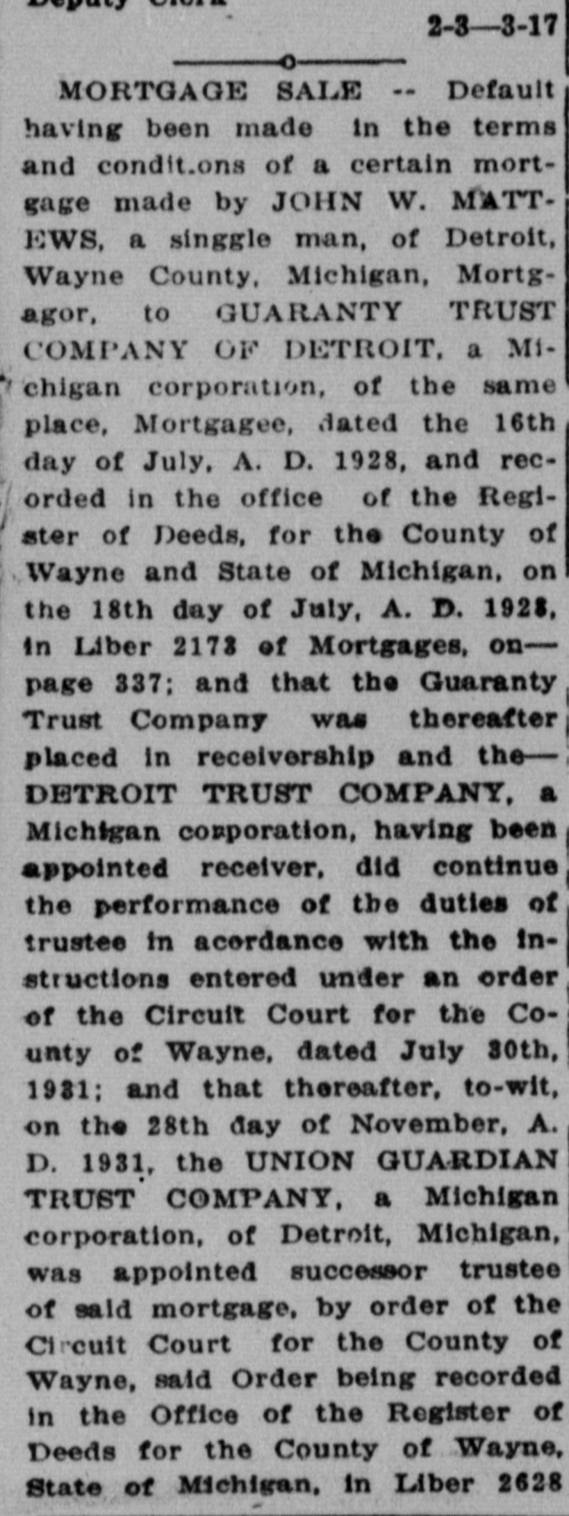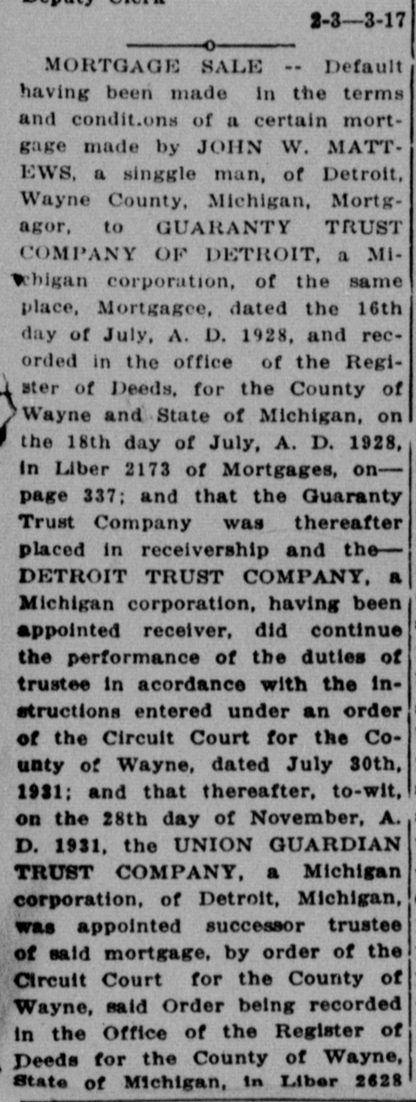 day of July, A. D. 1928, and recorded in the office of the Register of Deeds, for the County of Wayne and State of Michigan, on the 18th day of July, A. D. 1928, in Liber 2173 of Mortgages, on--page 337; and that the Guaranty Trust Company was thereafter placed in receivership and theDETROIT TRUST COMPANY, a Michigan corporation, having been appointed receiver, did continue the performance of the duties of trustee in acordance with the instructions entered under an order of the Circuit Court for the County of Wayne, dated July 30th, 1931; and that thereafter, to-wit, on the 28th day of November, A. D. 1931, the UNION GUARDIAN TRUST COMPANY, a Michigan corporation, of Detroit, Michigan, was appointed successor trustee of said mortgage, by order of the Circuit Court for the County of Wayne, said Order being recorded in the Office of the Register of Deeds for the County of Wayne State of Michigan, in Liber 2621 of Mortgages, page 51; and tha thereafter, on, to-wit, the 16thday of September, A. D. 1933 JAS. SWAN ELDRIDGE was ap pointed successor trustee of said mortgage, by Order of the Circuit Court for the County of Wayne, State of Michigan, and said appointment was accepted by JAS. SWAIN ELDRIDGE in writing on the 16th day of September, A. D. 1933 which said Order and Acceptance were recorded in the Office of the Register of Deeds for the County of Wayne, State of Michigan, on the 19th day of September, A. D. 1933, and recorded in Liber 1675 of Mortgages, pages 627 and 630, respectively: and that there is claimed to be due on said mortgage at the date of this notice, for principal and interest, the sum of TWO THOUSAND SIXTY-NINE and 30c($2,069.30) DOLLARS. No suit or proceedings at law or in equity having been instituted to recover the debt secured by said mortgage or any part thereof. Now, therefore, by virtue of the power of sale contained in said mortgage, and pursuant to the statute of the State of Michigan in such case made and provIded. notice is hereby given that on TUESDAY, the THIRTEENTH day of MARCH. A. D. 1934, at 12:00 o'clock Noon, Eastern Standard Time, said mortgage will be foreclosed by a sale at public auction, to the highest bidder, at the southerly or Congress street entrance to the County Building n the City of Detroit, Wayne Cointy. Michigan, (that being the building where the Circuit Court for the County of Wayne is held) of the premises described in said mortgage, or so much thereof as may be necessary to pay the amount due, as aforsaid, on said mortgage, with the Interest thereon at seven percent (7%) and all legal costs, charges and expenses., including the attorney fees allowed by law, and also any sum or sums which may be paid by the mortgagee, necessary to protect his interest in the premises. Which said premises are described as follows: All that certain piece or parcel of land situato in the City of Detroit, in the County of Wayne and State of Michigan, and described as follows, to-wit: Lot numbered One Hundred Sixty-three (163) HANNAN'S "BELT LINE ADDITION" being part of Private Claim 678, as recorded in ne County, Michigan, Records. Dated at Detroit, Michigan, December 13th, 1933. Jas. Swan Eldridge,' Assignee - Mortgagee. 12-23-1983. Jas. Swan Eldridge,