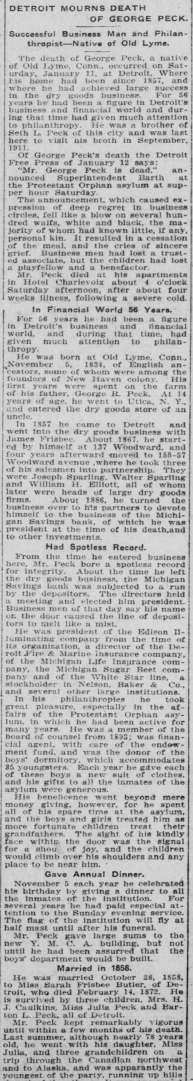 Successful Business Man and Philanthropist-Native of Old Lyme. The death of George Peck, a native Old Lyme, Conn., occurred on Satof urday, January 11, at Detroit, Where his home had been since 1857, and where he had achieved large success 56 in the dry goods business. For years he had been a figure in Detroit's durbusiness and financial world and ing that time had given much attention to philanthropy He was a brother of Seth L. Peck of this city and was last here to visit his broth in September, 1911. Of George Peck's death the Detroit Free Press of January 12 says: an"Mr. George Peck is dead," nounced Superintendent Barth at the Protestant Orphan asylum at supper hour Saturday The announcement, which caused expression of deep regret in business circles, fell like a blow on several hundred waifs, white and black, the majority of whom had known little, if any, personal kin. It resulted in a cessation the meal, and the cries of sincere of Business men had lost a trusted grief. associate, but the children had lost a playfellow and a benefactor. Mr. Peck died at his apartments Hotel Charlevoix about 4 o'clock Saturday in afternoon, after about four weeks illness, following a severe cold. In Financial World 56 Years. For 56 years he had been a figure in Detroit's business and financial world, and during that time, had given much attention to philanthropy. He was born at Old Lyme, Conn., November 5, 1834, of English ancestors, some of whom were among His the founders of New Haven colony. first years were spent on the farm of his father, George R. Peck. At 14 years of age, he went to Utica, N. Y., and entered the dry goods store of an uncle. In 1857 he came to Detroit and went into the dry goods business with James Frisbee. About 1867, he started by himself at 137 Woodward, and four years afterward :moved to 155-57 Woodward avenue where he took three of his salesmen into partnership. They were Joseph Sparling, Walter Sparling and William H. Elliott, all of whom later were heads of large dry goods firms. About 1886, he turned the business over to his partners to devote himself to the business of the Michigan Savings bank, of which he was president at the time of his death,and to other investments. Had Spotless Record. From the time he entered business here, Mr. Peck bore a spotless record for integrity. About the time he left the dry goods business, the Michigan Savings bank was subjected to a run by the depositors. The directors held a meeting and elected him president. Business men of that day say his name OL the door caused the line of depositors to melt like a mist. He was president of the Edison IIluminating company from the time of its organization, a director of the Deroit .Fire & Marine insurance company, of the Michigan Life Insurance company, the Michigan Sugar Beet coma pany and of the White Star line, stockholder in Nelson, Baker & Co., and several other large institutions. took In his philanthropies he great pleasure, especially in the affairs of the Protestant Orphan asylum, in which he had been active for many years. He was a member of the board of counsel from 1893; was financial agent, with care of the endewment fund. and was the donor of the boys' dormitory, which accommodates 35 youngsters. Each year he gave each of these boys a new suit of clothes, and his gifts to all the inmates of the asylum were generous. His beneficence went beyond mere money giving, however, for he spent all of his spare time at the asylum, and the boys and girls treated him as more fortunate children treat their grandfathers. The sight of his kindly face within the door was the signal for a shou of joy, and the children would climb over his shoulders and any place to be near him. Gave Annual Dinner. November 5 each year he celebrated all his birthday by giving a dinner to For the inmates of the institution. several years he had paid especial attention to the Sunday evening service. at The flag of the institution will fly half mast until after his funeral. Mr. Peck gave large sums to the new Y. M. C. A. building, but not the until he had been assurred that boys' department would be built. Married in 1858. He was married October 28, 1858, Deto Miss Sarah Frisbee Butler, of He troit, who died February 14, 1872. H. is survived by three children, Mrs. J. Caulkins, Miss Julia Peck and Barton L. Peck, all of Detroit. Mr. Peck kept remarkably vigorus until within a few months of his death. Last summer, although nearly 78 years Miss old, he went with his daughter, a Julia, and three grandchildren on trip through the Canadian northwest to Alaska, and was apparantly the and youngest of the party, running up hills