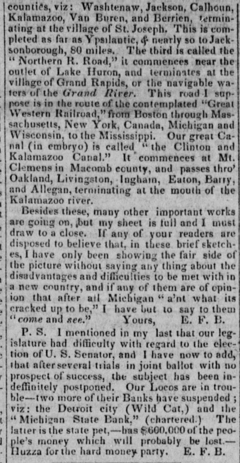 MICHIGAN INSURANCE COM. PANY. NATIONAL INSURANCE BANK. This company was chartered on March 7. 1834. but with powers however. which were deemed sufficient to authorize a banking business In fact it never did engage in any insurance business On January 15. 1838. its organization was completed and on January 24. 1838. opened its doors for business but doubt having been expressed upon the right of the company to do banking. favorable opinion was given by Governor Woodbridge James Abbott was its first president and was succeeded by Douglas Houghton, and he in turn by John Owen. who continued to serve as long as the company lasted Among its cashiers were H. H. L. H. K. Sanger and Walter The company first occupied quar ters in the Sheldon north1855 to the southwest corner of In the panic of 1857 it gave con siderable help to the Peninsular bank and the Farmers & Mechanics but were unable to save them from suspension By inducing its customers to accept drafts instead of gold, by the aid of depositors and on account of the great personal confidence all had in John Owen. the bank passed through the panic without suspension In June 25. 1865, having been reorganized as National bank. it opened for business as the "Michigan Insurance bank but four years later it was discontinued. some of the directors taking stock in the newly organized First Na tional bank MICHIGAN STATE BANK THE STATE BANK OF MICHIGAN The Michigan State bank was incorporated March 26, 1835, with capital of $100,000 which soon after was increased to $500,000. Among its directors John R. Williams. Robert McMillan. Ellis Doty, Barnabas Campau. Cullen Brown, John Hale nad John Truax It first was located on the north side of Jefferson avenue. between Woodward avenue and Bates street. F. H. Stevens president, and John Norton. Jr. cashier One day in the week, Wednesday, was designated as "discount day In 1837 the bank purchased the build. ing on the south side of Jefferson avenue, formerly occupied by the Bank of Michigan On April 2, 1839, the bank suspended and George F. Porter was appointed assignee. On the same day the legislature authorized the organization of bank to be called "The State Bank Michigan.' with a capital of $2,000,000. with power to increase it to $5,000,000. half of which should belong to the state. This combination was practically merger of Bank of Michigan and the Farmers & Mechanics bank The plan contemplated big central bank with seven branches Business, however, was not brisk and as the merger was required by the statute to be completed by given date and this failed to be done, the interested parties gave up the undertaking However, in 1845, H. P. Baldwin, Zachariah Chandler, Moore. Henry Ledyard C. H. Buhl. C.C. Trowbridge James F. Joy and George F. Porter formed a corpora tion to buy up the stock of the anew Its capital was $150,000. Its president was C. C. and its cashier A. H. Adams The
