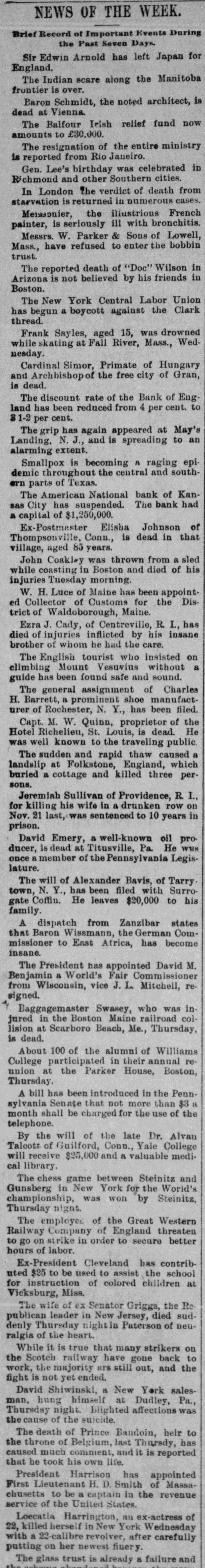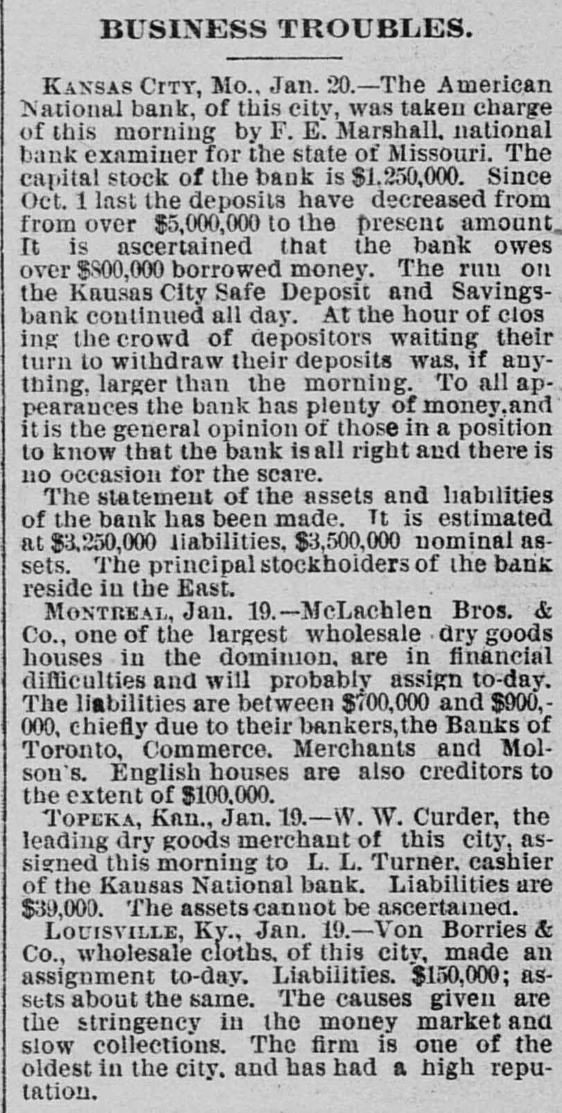 AN IRREGULAR PRACTICE.-Secretary Windom has informed Secretary Blaine, in regard to the practice of presenting invoices for certification at Paso del Norte. Mexico, covering goods shipped to the United States from other consular districts, that the collector of customs at El Paso, Texas, has been instructed to cooperate with the United States consul at Paso del Norte in enforcing the law upon shippers and carriers on the Mexican Central railroad and putting an end to said irregular practice. IN FAVOR OF THE GOVERNMENT.-The Treasury Department has authorized the free entry of three cases imported at New York addressed to the Secretary of State and containing copies of a volume of the survey of India, intended for the different departments, scientific NOcieties, educational institutions and libraries. As there is no provision of law authorizing the free entry of books for private persons the collector at New York has been instructed to collect duty on copies contained in the cases in question intended for T. W. Wright, civil engineer, Schenectady, N.Y., and Peof. J. E. Hilgard, late of the geodetic survey. To HONOR MR. BANCROFT.--The following order was issued today from the Executive Mansion: The death of George Bancroft, which occurred in the city of Washington on Saturday, January 17. at 3:40 o'clock p.m., removes from among the living one of the most distinguished Americans. As an expression of the public loss and sorrow the flags of all the executive departments at Washington and of the public buildings in the cities through which the funeral party is to pass will be placed at halfmast on tomorrow and until the body of this eminent statesman, scholar and historian shall rest in the state thatgave him to his country and to the world. By direction of the President. E. W. Halford, private secretary. THE KANSAS CITY BANK FAILURE.-Mr. Lacey, controller of the currency, received a telegram this morning from Bank Examiner Marshall announcing the suspension of the American National Bank of Kansas City, Mo. He said that he received word from the examiner Saturday that there had been a heavy run on the bank and that the situation looked serious. He added, however, that he did not think the bank's liabilities exceeded $1,000,000, which is $250,000 less than its capital stock. In reply the controller instructed him to take chai ge of the bank in case the run continued this morning and, judging from the fact that the examiner had taken charge, he supposed it had. The controller mid that while he bad no definite information on the subject he supposed the bank was suffering from its efforts to assist its correspondents in Kansas, four of which had failed during the recent stringency.