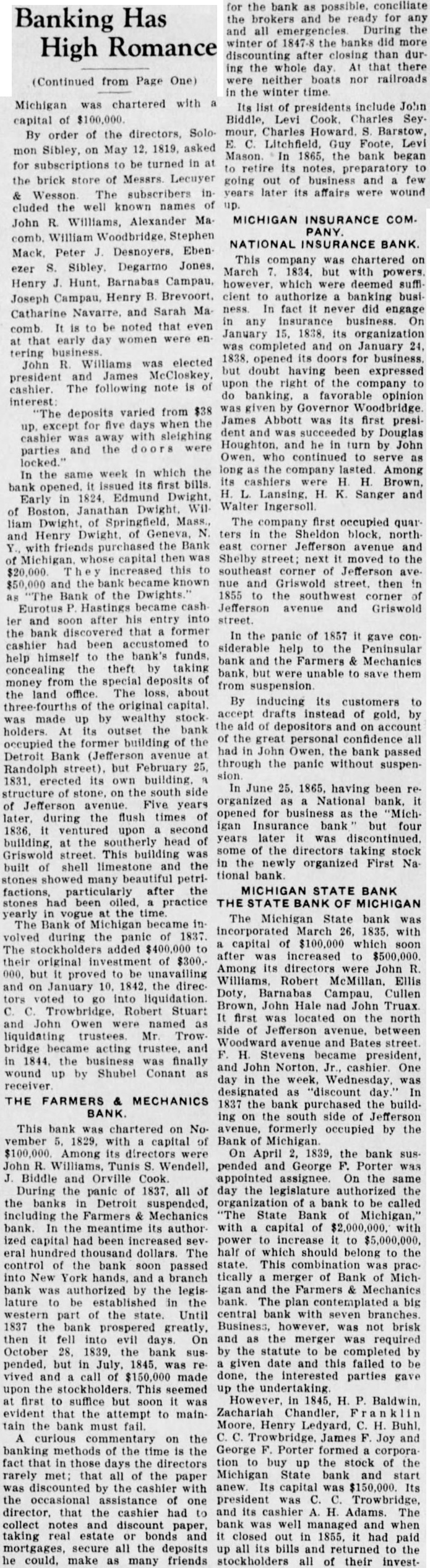 This bank was chartered on No. vember 5, 1829, with a capital of $100,000 Among its directors were John R. Williams, Tunis S. Wendell. J. Biddle and Orville Cook. During the panic of all of the banks in Detroit suspended, including the Farmers & Mechanics bank. In the meantime its author ized capital had been increased sev. eral hundred thousand dollars. The control of the bank soon passed into New York hands. and branch bank was authorized by the legislature to be established in the western part of the Until 1837 the bank prospered greatly. then it fell into evil days On October 1839, the bank sus pended, but in July, 1845. was revived and call of $150,000 made upon the stockholders. This seemed at first to suffice but soon it was evident that the attempt to maintain the bank must fail. curious commentary on the banking methods of the time is the fact that in those days the directors discounted by the cashier with the occasional assistance of one that the cashier had to for the bank as possible, conciliate the brokers and be ready for any and all emergencies During the winter of 1847-8 the banks did more discounting after closing than during the whole day At that there were neither boats nor railroads in the winter time Its list of presidents include John Biddle, Levi Cook. Charles Sey. mour, Charles Howard. S. Barstow, E. C. Litchfield. Guy Foote, Levi Mason. In 1865, the bank began to retire its notes, preparatory to going out of business and a few years later its affairs were wound up.
