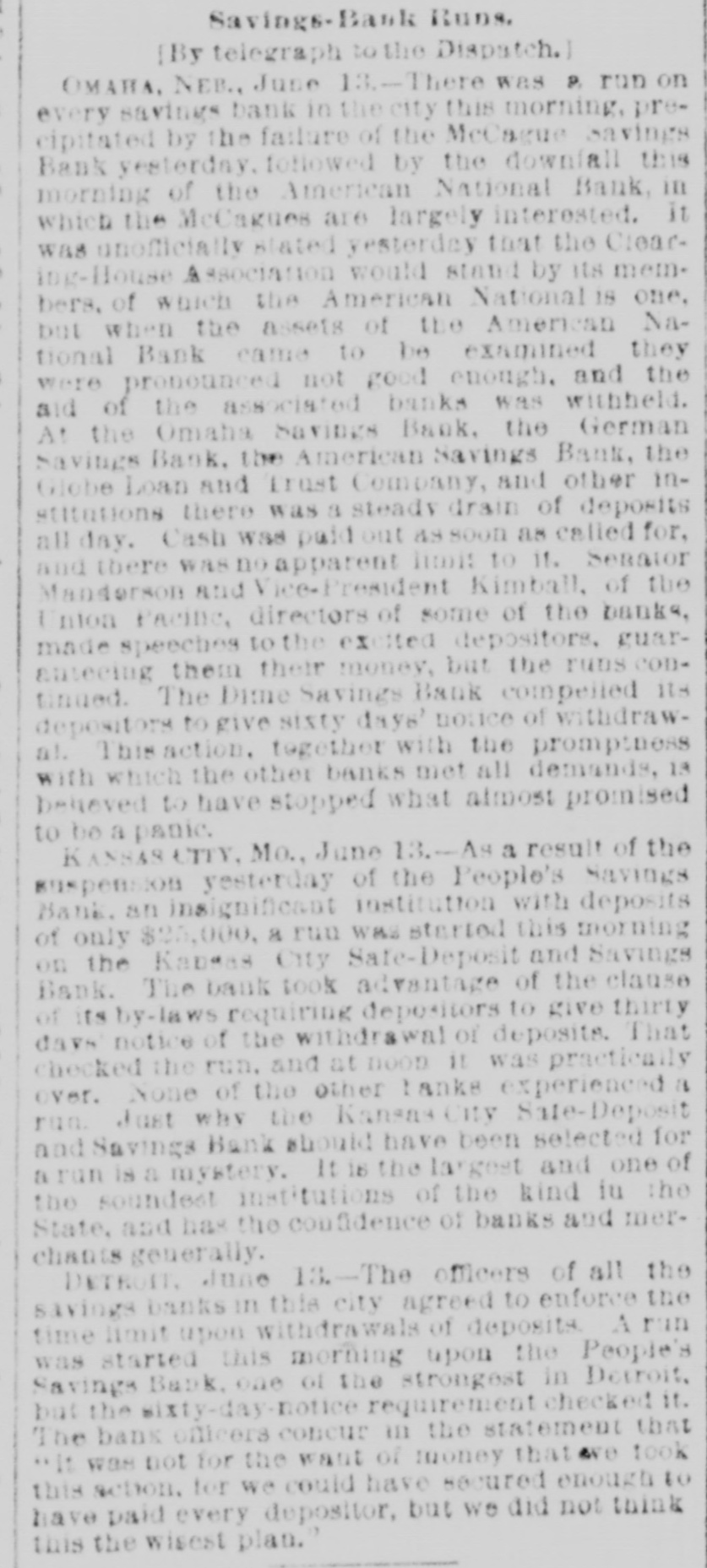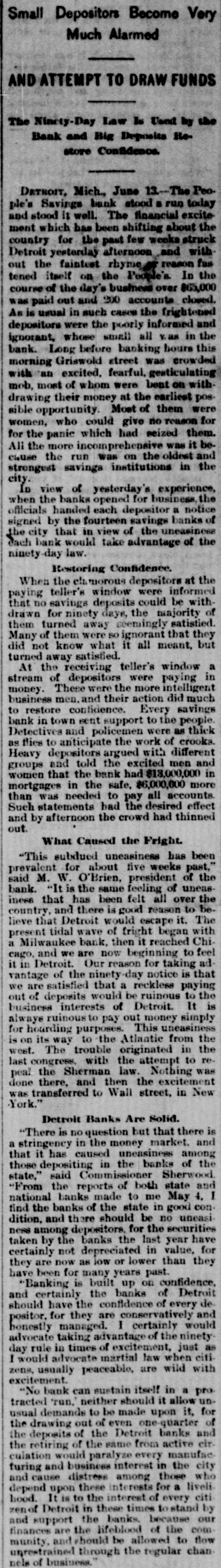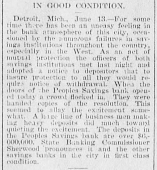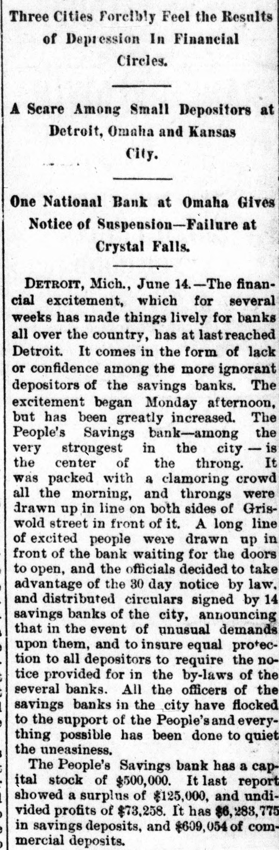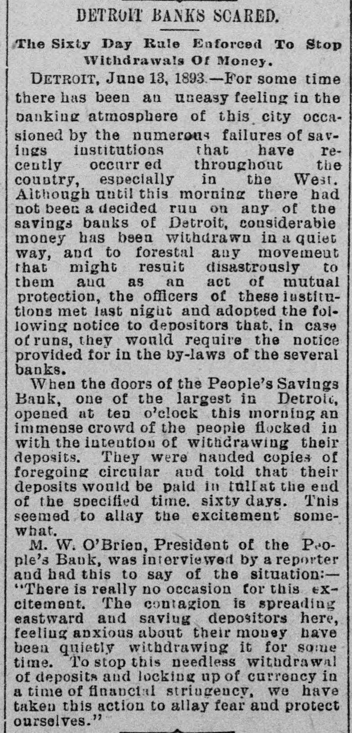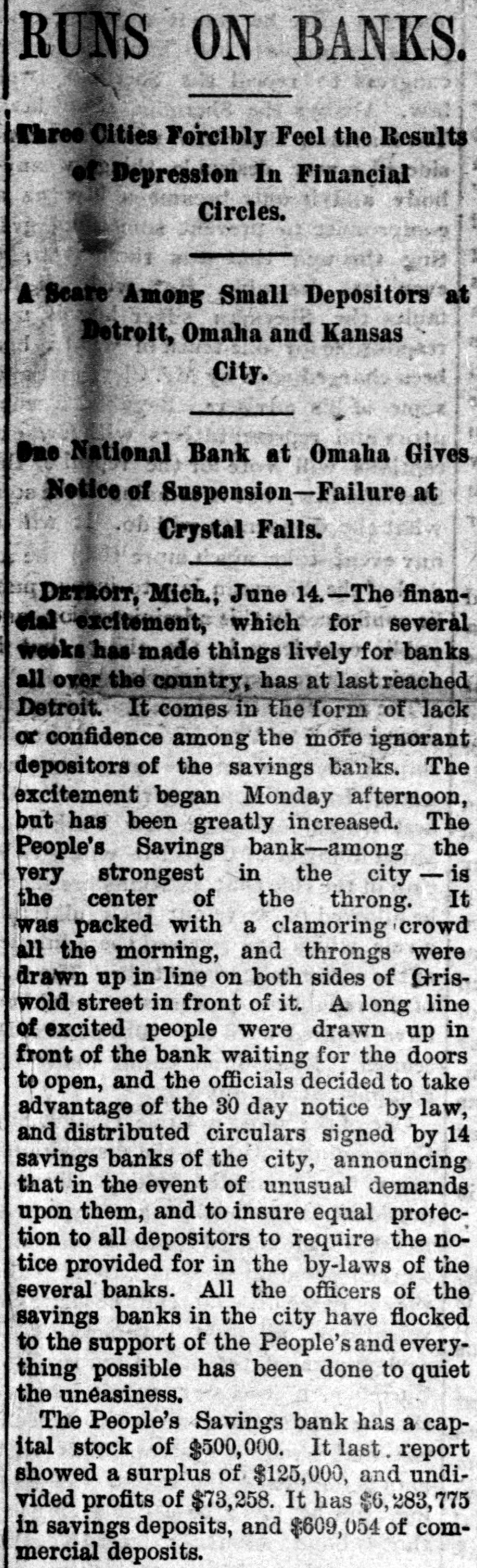 DETROIT BANES REQUIRE NOTICE. Savings Cannot be Withdrawn Except Under the Ninety Days Notice-A Run Started and Checked. DETROIT, MICH., Jnne 13.--For some time there has been an uneasy feeling in the banking atmosphere of his city, occasioned the numerous that have the country, espeoccurred saving institutions throughout by failures recently there cially had Although in the been until West. this morning not a decided run on of the banks considersavings has been of Detroit, any able money withdrawn in a to movement to quiet that way, might and result forestall disastrously any them and as an act of mutual protection, the officers of those institutions met last night and adopted the following notice to depositors: "There has recently been developed in our city an uneasiness among saving depositors which has been (without cause) directed against some of our strongest banks. To stop the heedless withdrawal of deposits and the lecking up of currency in a time of financial stringency, the undersigned banks respectfully decide in the event of unusual demands OH them and to ensure equal protection to all their depositors, to require the notice provided fori the by-laws of the several banks. "We would, therefore, ask our depositors to review the situation calmly and accept with patience our action, which is taken in our mutual interest and for the benefit of the country at large. "PEOPLE'S SANINGS BANK, "MICHIGAN SAVINGS BANK, "DETROIT SAVINGS BANK, "CITIZENS' SAVINGS BANK, "HOME SAVINGS BANK, "CITY SAVINGS BANK, "WAYNE COUNTY SAVINGS BANK, "CENTRAL SAVINGS BANK, "DETROIT RIVER SAVINGS BANK, "PENINSULAR SAVINGS BANK, "DIME SAVINGS BANK, "GERMAN-AMERICAN BANK, "AMERICAN BANKING AND SAVINGS AssociTION, "STATE SAVINGS BANK." doors of the SavWhen Bank, the largest Peoples in ings one of the Detroit, opened at 10 o'clock this morning an immense crowd of people flocked in with the intention of their were handed of depossts. foregoing They withdrawing told copies the circular and that their deposits would be paid in full at the end of the specified time-90 days. This seemed to allay the excitement somewhat. M. W. O'Brien, president of the Peoples was interviewed the Associated and had this to Bank Press by say: really no this The is excitement. "There and is the contagion occasion for spreading to stop needless withdrawal of and of currency in a we deposits time taken of financial looking stringency up have this action to allay fear." At the people's Bank things began to quiet no down when for it was seen there was of men to toward the had business occasion much de making alarm. quelling heavy A long deposits line citement and everything is comparatively quiet at the other banks. Deposits in the People's Saving Bank amount to over $6,000,000. State Banking Commissioner Sher. wood pronounces it and the other savings bank in the city in a first class condition and says there is no occasion for alarm. OMAHA, NEB., June 13.-The American National Bank was closed by order of the comptroller of currency this morning. Runs started on the Globe Loan & Trust Co., the Dime Savings Bank, the German Savings Bank and Nebraska Savings Bank. No statement of the condition of of the American National is made at once except the fact that the clearing house refused to assist it. It is understood that the affairs of the bank are entangled with those of the McCague Savings Bank that closed yesterday afternoon. The run was of extensive proportions en the Omaha Savings Bank and all the morning the bank was besieged by depositors. Senator Manderson and Vice President Kimball of the Union Pacific, directors of the bank, made speeches to the excited depositors guaranteeing them their money, but the run continued. COLUMBUS, O., June 13.-The Franklin Buggy Company has been put in the hands of a receiver. It is the smallest and youngest company in this business in Columbus. Liabilities are stated to be about $75,000. Assets will hardly cover that sum. The concern was not making money, and the receivership is said to be intended to wind up a losing business on account of the tightening of the times. CLEVELAND, O., June 13.-At the instance of the National Bank of Commerce, W. M. Reynolds was to-day appointed receiver of the Williams Publishing Company, a company doing a large printing and publishing business. The assets and liabilities are not known. NEW YORK, June 13.-Defalcations ag gregating $70,600 have been discovered in the Irving Savings Institution, 96 Warren street, New York. The shortage was discovered by the State Bank Examiners, who are still at work on the books and will not complete their work of the accounts some as there are accounts to 17,000 bank's individual for time, scrutinizing investigate besides the regular bank books.