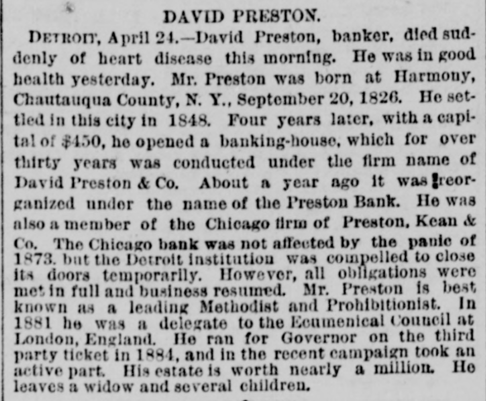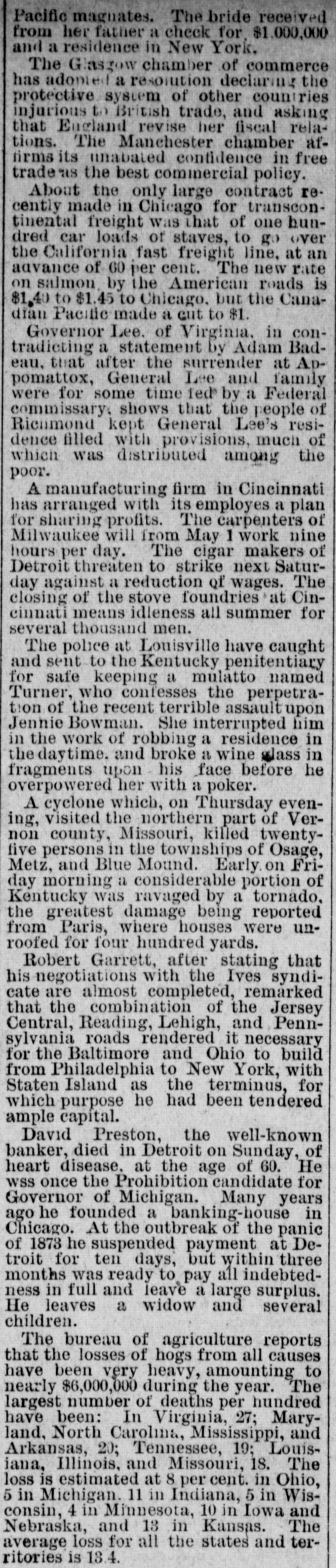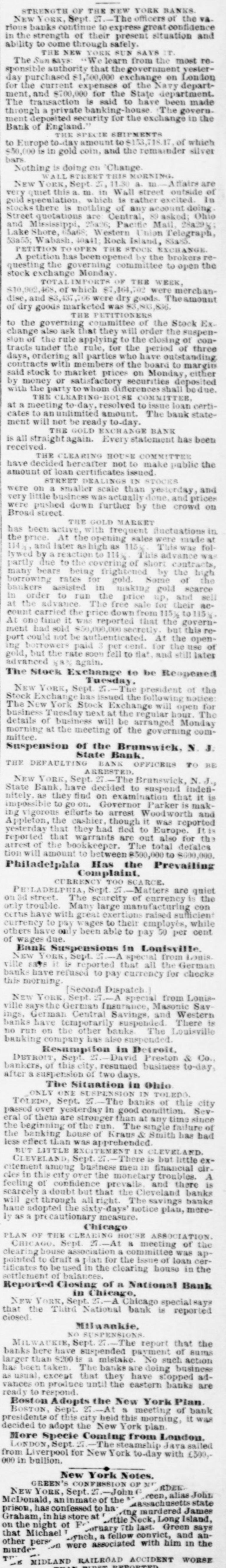 STRENGTH OF THE NEW YORK BANKS the Sept 27 The officers of va. rious banks continue NEW YORK, to express great confidence and in the strength of their present situation ability to come through safely THE NEW SUN SAYS T The Sun says: W learn from the most reexchange sponsible authority that the governm ment en London yesterpurchased $1,500,000 departday current expenses of the for the $700,000 for the State department. ment and action is said to have been made The trans private banking house The govern- the ment deposited through security for the exchange in Bank of England PECIE SHIPMENTS of to which to $50,000 Europe is in to-day gold coin, amount and the remainder silver STREET bars Nothing is doing on Change THIS MORNING. III Attairs are NEW YORK, Sept 11.30 street outside of ervomet this a. m in Wall rather excited. In very speculation whield is account doing are Central stocksthere is nothing of any asked Ohio Street guotations Pacific Mail 28a29 % Lake Shore, and Mississippi, 5a68 W estern Union Telegraph, 83a85. TO THE OPEN 53a55, Wabash 40a41 Rock Island, EXCHANGE rePETITION petition has beenopened the brokers the questing A the governing committee to open TOTAL IMPORTA stock exchange Monday F THE WEEK $10,902,468. of which 87,464 were merchandise. and were dry goods The amount of dry goods marketed THE PETITIONERS was $3,803 836. the governing committee of the Stock Exto that they will order the suspenston change of also ask the rule applying to the closing of of three conall tracts under the rule, parties for who the have period outstanding days, ordering with members of the board to margin said stock contracts to market prices securities on Monday, deposited either the with party by money or satisfactory to whom differences shall bedue. SE HOL C LEARING COMMITTEE a meeting THE to-day, resolved to issue bank state loan certicates at to an unlimited amount. The ment will not be ready to-day. GOLD EXCHANGE BANK is all straight again THE Every statement has been received THE CLEARING HOUSE COMMITTEE have decided hereafter not to make public the amount of loan certificates issued STREET DEALINGS IN smaller scale than yest day, and were on business wasactually and prices Broad street were very little pushed down further by the crowd on THE GOLD MARKET frequent inetuations in has been a At the opening sales were made at This the price. and later as high as 115% This advance was fol partly Ivwed by due to the overing of short contracts, the high many bears being fright by of in bankers assisted gold making borrowing rates for gold Some scarce and sel The free sale in order to run the price their acthe count carried price at advance down from 115 to 115 that the governAt one time it was reported but this repaid ment port could had sold not be authenticated. for At the the use open- of again. ing gold, but the rate 80011 fell to flat and still later Tuesday, The advanced stock Ex change to be Re expened 2.-The of the president has Exchange NEW YORK, Sept issued the following notice Stock The New York Stock Ex change will hour open The for "uesday next at the regular business of business will be arranged Monday details morning at the meeting of the governing committee. of the Brunswick. N J Suspension State Bank BRESTED THE DEFAULTING BANK OFFICERS TO BE New YORK Sept The Brunswick, N.J. State Bank have decided to suspend that indeti- it is to go on. Governor nitely as they find on examini ation Parker is makimpossible efforts to arrest Woodworth and ing vigorou the cashier, though it was reported Appleton, that they had fled to Europe It is vesterday that warrants are out also for the reported The total defales of the bookkeeper. $600,000. tion arrest will amount to between @500,000 to Philadelphia Has the Prevailing Complaint. TOO RCE. CURRENC Sept. Matters are quiet PHILADELPHIA, The scarcity of currency is the only trouble 3d street Many large nufacturing raised sufficient con cernshave with great wages to their employes, while cent others have only currency been able to pay 50 per wages due. A Sept special of Bank Suspensions in Lonisville, from Louis German as reported that all the checks bank ville have refused to pay currency for this morning Second Dispatch Louis NEW YORK Sept. special asonic from Sav German Insurance Western ville saysthe Central Savings and There is no on run ings, German suspend Louisville bank have the temporaril other banks The ended banking company has David Resumption in Detroit, Preston & Co. bankers, of this city DETROIT, Sep resumed business to-day after a suspension of two days. The Situation in Ohio TOLEDO TOLEDO, ONLY ONE Sept. 27 The banks of this city vesterday in good condition. time since Sevpassed over stronger than at any eral of them are the run. The single failure of the beginning banking house of of raus & Smith has bad the less effect than was apprehended LEVELAND. EXC TEMENT IN BUT LITTLE Sept There is but little exeitement among CLEVELAND, business men in financial air A cles in this enty over the monetary and troubles. there is feeling of confidence prevails Cleveland banks a doubt but that the banks scarcely all right The savings have will get adopted through the sixty days' notice plan, merely as pre cautionary measure. Chicago PLAN THE H ASSOCIATION OF Sept CLEAR 27 At a meeting of the CHICAGO. house association a committee was cer- apclear draft plan for the issue of loan the pointed fificates to to be used in the clearing house in Reported settlement Closing Chicago, of a National Bank that Sept in A Chicago special says closed NEW the YORK Third National bank is reported Milwankie. MILWAUKIE,Sept The report that of sums the here have spended payment such action The larger banks than $200 is a mistake banks are No doing business has been taken except that they have stopped are adrespond. vances usual on produce until the eastern banks ready Boston to Adopts the New York Plan of bank Sept. 27.-At s meeting BOSTON, of this city held 