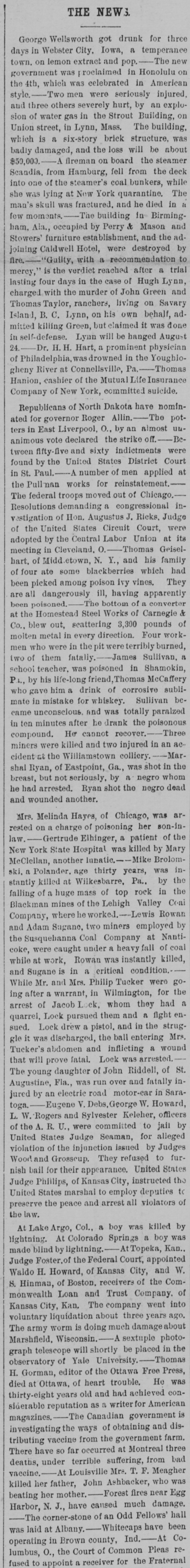 THE NEWS. George Wellsworth got drunk for three days in Webster City, Iowa, a temperance town. on lemon extract and pop.-The new government was proclaimed in Honolulu on the 4th, which was celebrated in American style.-Two men were seriously injured, and three others severely hurt, by an explosion of water gas in the Strout Building, on Union street, in Lynn, Mass. The building. which is a six-story brick structure, was badly damaged, and the loss will be about $50,000.- flreman on board the steamer Scandia, from Hamburg, fell from the deck into one of the steamer's coal bunkers, while she was lying at Now York quarantine. The man's skull was fractured. and he died in a few moments.- building in Birmingham, Ala., occupied by Perry & Mason and Stowers' furniture establishment, and the adjoining Caldwell Hotel, were destroyed by flre.-"Guilty, with a recommendation to mercy," is the verdict reached after a trial lasting four days in the case of Hugh Lynn, charged with the murder of John Green and Thomas Taylor, ranchers, living on Savary Island, B. C. Lynn, on his own behalf, ndmitted killing Green, but claimed it was done in self-defense. Lynn will be hanged August H. H. Hart, a prominent physician of Philadelphia,was drowned in the Youghlogheny River at Connellsville, Pa.-Thomas Hanion, cashier of the Mutual feInsurance Company of New York, committed suicide. Republicans of North Dakota have nominated for governor Roger Allin.-The potters in East Liverpool, O., by an almost unanimous vote declared the strike off.-Between fifty-five and sixty indictments were found by the United States District Court in St. Paul.-A number of men applied at the Pull nan works for reinstatement.The federal troops moved out of Chicago.Resolutions demanding a congressional investigation of Hon. Augustus J. Ricks, Judge of the United States Circuit Court, were adopted by the Central Labor Union at its meeting in Cleveland, O.-Thomas Geiselhart. of Midd.etown, N. Y., and his family of four ate some blackberries which had been picked among poison ivy vines. They are all dangerously ill, having apparently been poisoned.-The bottom of a converter at the Homestead Steel Works of Carnegie & Co., blew out, scattering 3,300 pounds of molten metal in every direction. Four workmen who were in the were terribly burned, two of them fatally.-James Sullivan, a school teacher, was poisoned in Shamokin, P.., by his life-long friend, Thomas McCaffery who gave him a drink of corrosive sublimate in mistake for whiskey. Sullivan became unconscious. and was totally paralzed in ten minutes after he drank the poisonous compound. He cannot recover.-Three miners were killed and two injured in an accident at the Williamstown colliery. shal Ryan, of Eastpoint, Ga., was shot in the breast, but not seriously, by a negro whom he had arrested. Ryan shot the negro dead and wounded another. Mrs. Melinda Hayes, of Chicago, was arrested on a charge of poisoning her son-inlaw.-Gertrude Elhinger, a patient of the New York State Hospital was killed by Mary McClellan, another Innatic.-Mike Brolomski, a Polander. age thirty years, was instantly killed at Wilkesbarre, Pa., by the falling of a huge mass of top rock in the Blackman mines of the Lehigh Valley Coal Company, where he worked.-Lewis Rowan and Adam Sugane, two miners employed by the Susquehanna Coal Company at Nanticoke, were caught under a heavy fall of coal while at work, Rowan was instantly killed, and Sugane is in a critical condition.-While Mr. and Mrs. Philip Tucker were going after a warrant, in Wilmington, for the arrest of Jacob Lock, whom they had a quarrel, Lock pursued them and a fight ensued. Lock drew a pistol, and in the struggle it was discharged, the ball entering Mrs. Tucker's abdomen and inflicting a wound that will prove fatal. Lock was arrested.The young daughter of John Riddell, of St. Augustine, Fla., was run over and fatally injured by an electric road motor-car in Saratoga.-Eugene V. Debs,George W. Howard, L. W. Rogers and Sylvester Keleher, officers of the A. R. U., were committed to jail by United States Judge Seaman, for alleged violation of the injunction issued by Judges Wood and Grosscup. They refused to furnish bail for their appearance. United States Judge Phillips, of Kansas City, instructed the United States marshal to employ deputies to preserve the peace and arrest all violators of the law. At Lake Argo, Col., a boy was killed by lightning. At Colorado Springs a boy was made blind by lightning. Kan., Judge Foster. of the Federal Court, appointed Waldo H. Howard, of Kansas City, and W. S. Hinman, of Boston. receivers of the Commonwealth Loan and Trust Company. of Kansas City, Kan, The company went into voluntary liquidation about three years ago. The army worm is doing much damageabout Marshfield. Wisconsin.-A sextuple photograph telescope will shortly be placed in the observatory of Yale University.-Thomas H. Gorman, editor of the Ottawa Free Press, died at Ottawa, of heart trouble. He was thirty-eight years old and had achieved considerable reputation as a writer for American magazines.-The Canadian government is investigating the ways of obtaining and distributing vaccine from the government farm. There have so far occurred at Montreal three deaths, under terrible suffering, from bad